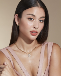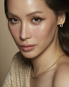 หญิงสาวผู้เป็นตัวแทนของความโก้หรู สง่างาม เหนือกาลเวลา ด้วยผิวหน้าเรียบเนียบ บริสุทธิ์ คอนทัวร์ใบหน้าบางเบาอย่างเป็นธรรมชาติ เผยให้เห็นโครงหน้าสวยได้รูป ไล้สีเปลือกตาละมุนด้วยโทนสีคอปเปอร์จางๆ และริมฝีปากสีชมพู แลดูอ่อนโยนราวกลีบดอกไม้