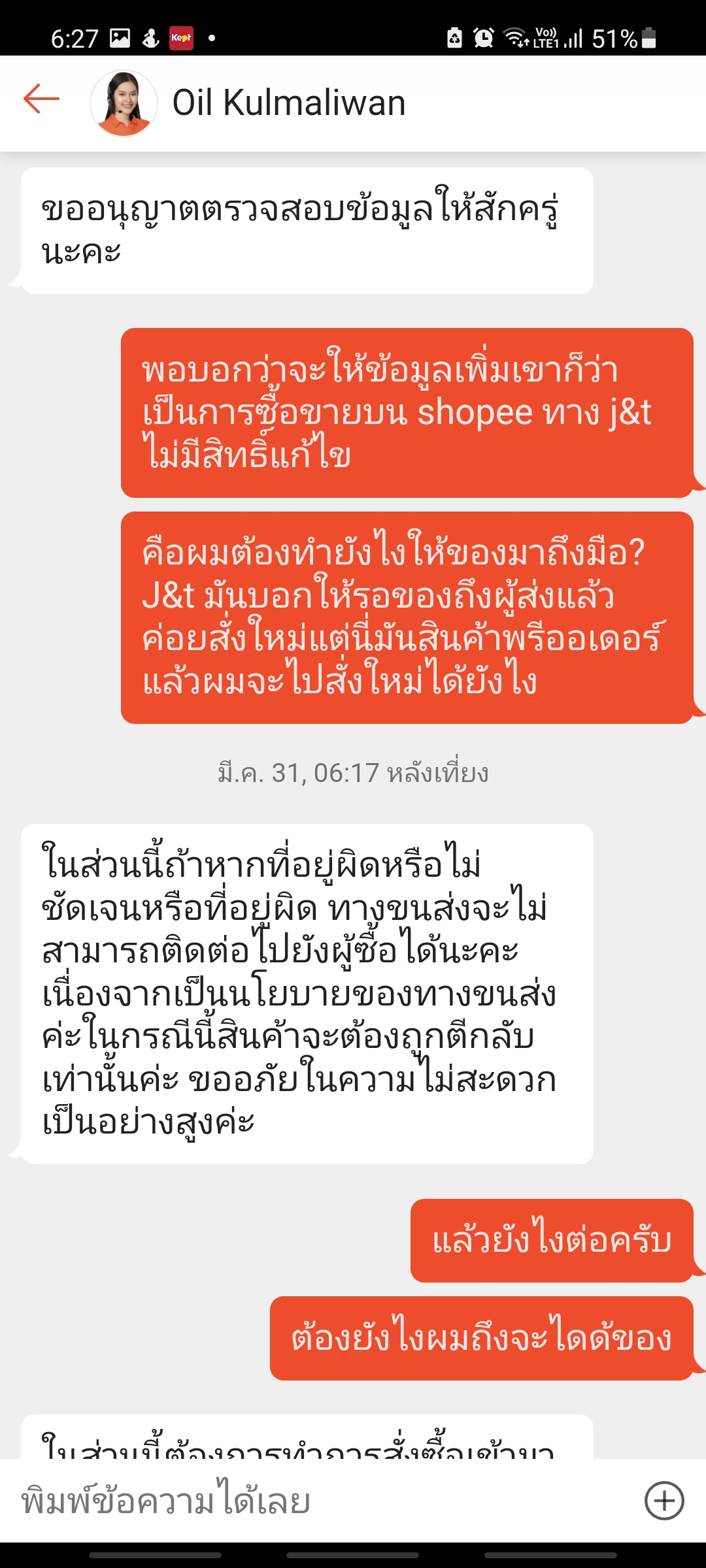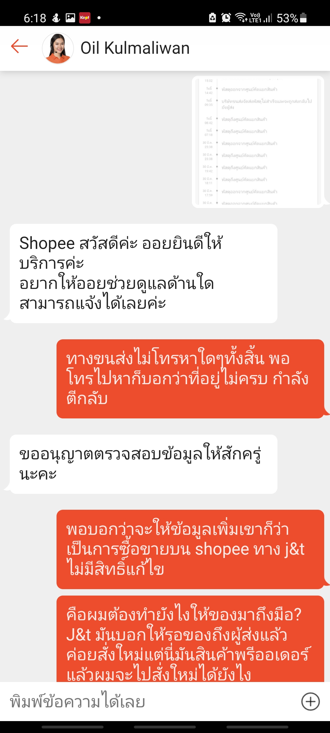 สั่งของพรีออเดอร์บน shopee มาจากต่างประเทศ ปรากฎว่ามาเช็คอีกทีเมื่อวานขนส่งบอกนำสืงไม่สำเร็จกำลังตีกลับเราก็อ้าวเฮ้ย! รีบติดต่อ shopee ซึ่งก็บอกให้ไปติดต่อขนส่งเองพอบอกว่าส่งกับใครมาก็คิดเลยว่าเอาแล้ว ไอ้บริษัทเ*ยนี่อีกแล้ว เพราะจากปะสบการณ์ที่ผ่านมาหาดีไม่ได้เลยกับบริษัทนี้ ซึ่งก็เป็นตามนั้นเพราะมันบอกกลับมาเลยว่านี่เป็นการซื้อผ่าน shopee แล้ว j&t ขอไม่ยุ่งผมบอกจะให้ข้อมูลที่อยู่เพิ่มก็ไม่เอาบอกปัดให้โทรมาใหม่ทีหลังเหมือนพยายามโยนขี้ให้เพื่อนร่วมงานคนอื่นแทน สุดท้ายได้ข้อสรุปว่าให้รอของไปถึงสาขาปลายทางค่อยไปรับเอง(พนักงานที่คุยบอกของยังไม่ถึงสาขาปลายทาง) ผมก็ถามว่าของจะไปลงที่ไหนก็ไม่ยอมบอก บอกว่ารอของไปถึงก่อนค่อยโทรหาอีกรอบ