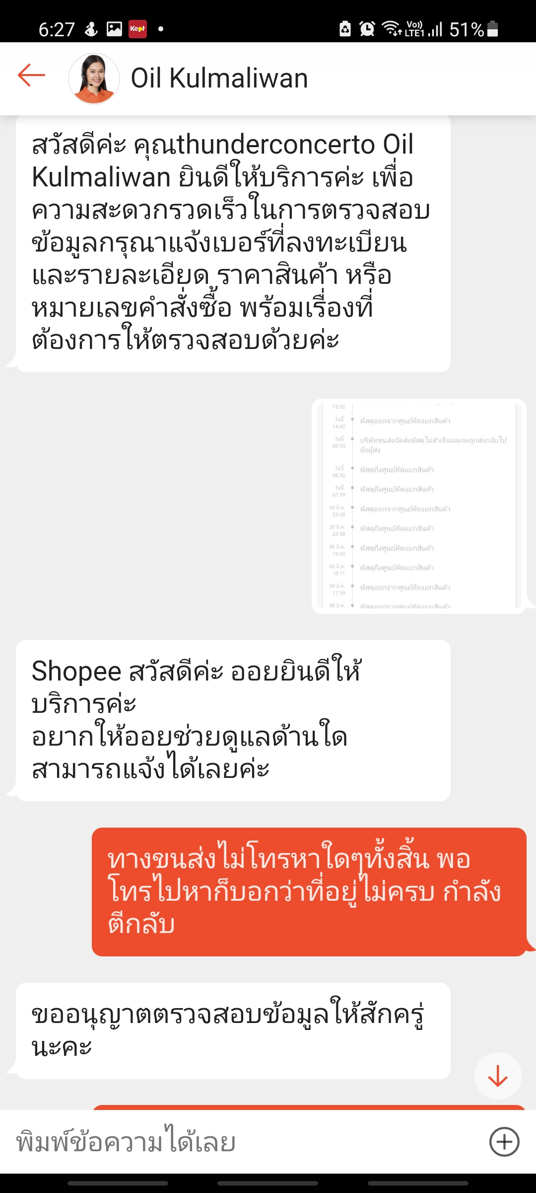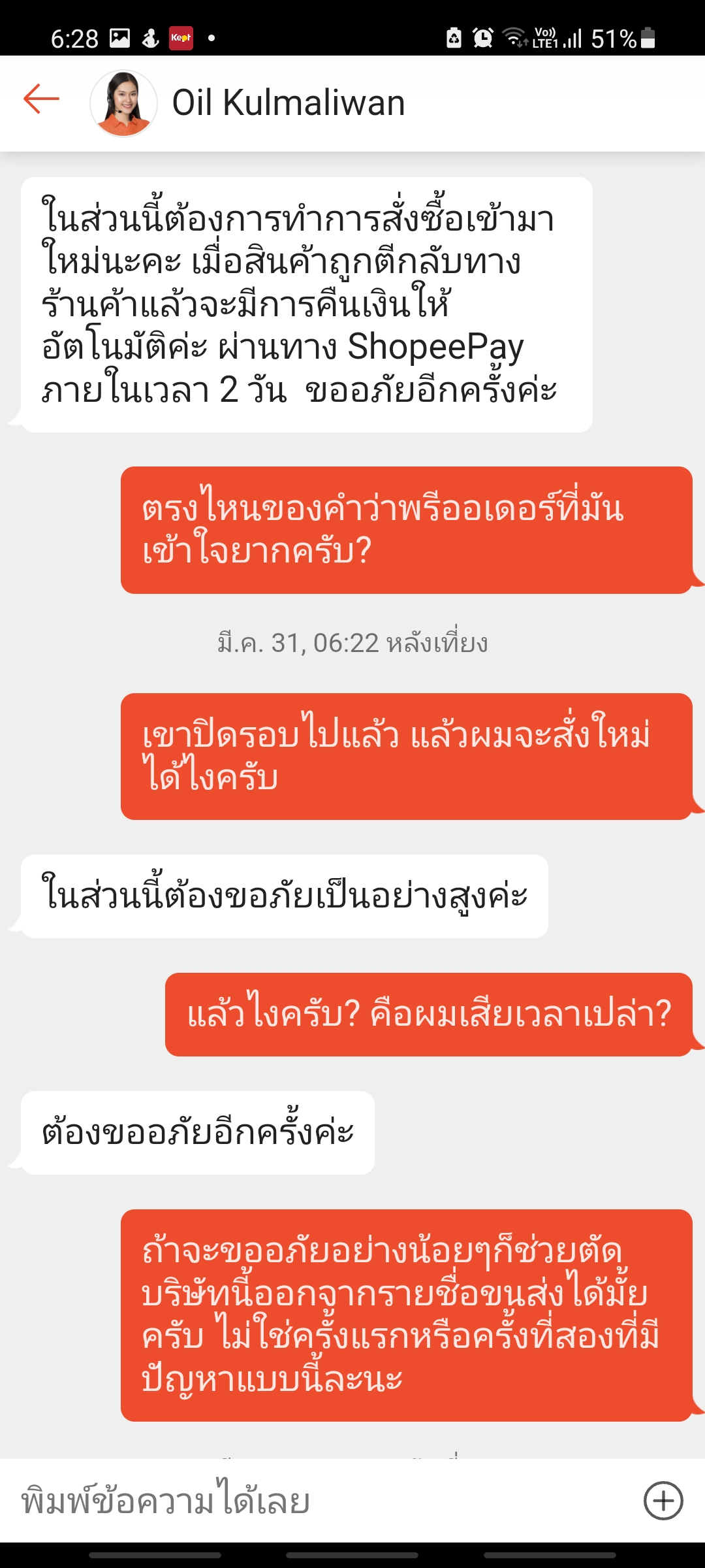 ไอ้เราก็ใจคอไม่ดีละเพราะของเป็นพรีออเดอร์ไม่ใช่ของซื้อปกติวันนี้ก็ติดต่อหา shopee อีกรอบแต่ก็เหมือนเดิมคือทำอะไรไม่ได้ แล้วเรื่องก็คือพอโทรไปเช็คกับ j&t กะจะถามว่าของมาหรือยังจะได้ไปรับปรากฎว่าของตีกลับไปแล้ว! ตลอดเวลาไม่มีการโทรหาหรือติดต่อใดๆทั้งสิ้นพนักงานคนนี้ก็บอกว่าก็ของมันตีกลับไปแล้วค่ะเหมือนไม่ใช่เรื่องตัวบอกถ้าอยากได้ของก็รอเงินคืนแล้วไปซื้อใหม่เองอีกรอบซึ่งผมก็พยายามอธิบายว่าของมันพรีออเดอร์มันปิดรอบไปแล้วจะไปสั่งใหม่ได้ยังไงพนักงานเขาก็ตอบมาแบบเริ่มมีขึ้นเสียงให้ไปติดต่อกับบริษัทแล้วซื้อนอกรอบกันเอาเอง! ประทานโทษ! ของสั่งจากต่างประเทศโดนไล่วให้ไปนอกรอบเอง? จะบ้าเหรอครับถ้าผมพูดภาษาเขาได้แล้วผมจะซื้อผ่านแอพตัวกลางเพื่อ? แล้วที่คือพอเช็ครหัสสินค้าแล้วปรากฎว่าตอนที่ผมคุยกับพนักงานคนก่อนหน้า(ที่บอกของยังไม่ถึง)ของมันไปถึงปลายทางแล้ว! เฮ้ย!? ไหนบอกยังไม่ถึงไง? ถ้าถึงแล้วทำไมไม่บอกความจริงผมจะได้ไปรับของเองทำไมต้องมาโกหกกันด้วย? แล้ววันนี้ทั้งวันก็ไม่มีการติดต่อใดๆถึงผมเลยแล้วตีของกลับไปเฉย!? คืออะไร!? จากนั้นพนักงานคนนี้ที่คุยด้วยอยู่ก็ถามเสียงห้วนๆว่ามีอะไรจะถามอีกมั้ยคะ ถ้าไม่มีจะวางแล้วนะคะ