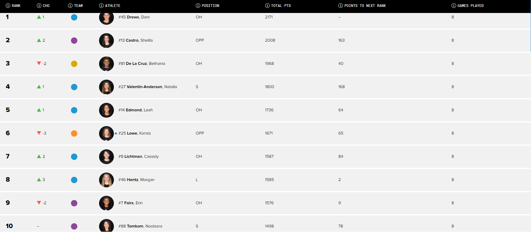 วีคสุดท้ายเจเจ้ของเรายังคงอยู่กับ Linnehan ( สีส้ม ) ดูจากองค์ประกอบทีมแล้วไม่ค่อยต่างจากเดิมเท่าไหร่ แต่ Setter อีกคนเป็นยัยกลาส OH 1 / Linnehan OH 2 / Cruz OH 3 / Erin Fairs OP 1 / Willo
