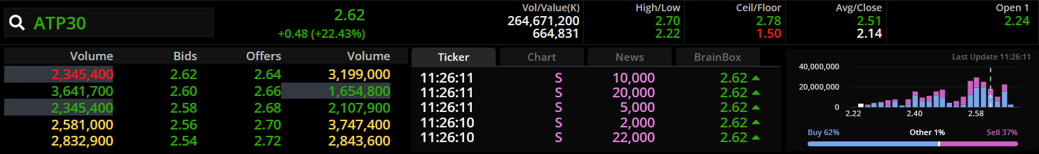 วันนี้ 5/4/2565 atp30 ร้อนแรงทั้งราคาและปริมาณ ณ 16:26 ด้วยปริมาณซื้อ 664.831 ล้านบาท และ ราคา 2.62 (PE53.62)
