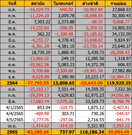 Sinthorn Summary : 5/4/2565 : ต่างชาติซื้อสุทธิ 2,716.55 ลบ.