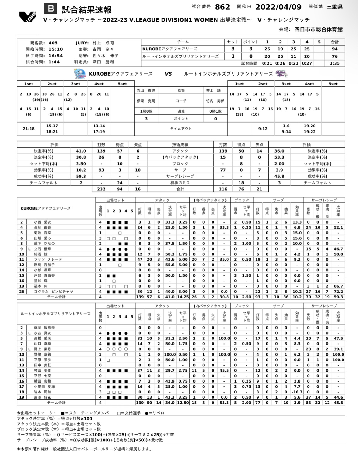 สถิติ V-league รอบเพลย์ออฟ Kurobe (บีม) - Brilliant Kries