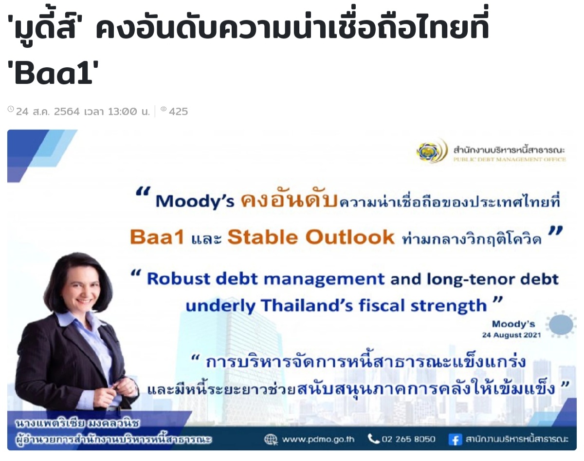 วันที่ 24 ส.ค. 2564 นางแพตริเซีย มงคลวนิช ผู้อำนวยการสำนักงานบริหารหนี้สาธารณะ กล่าวว่า บริษัท Moody’s Investors Service (มูดี้ส์) ได้คงอันดับความน่าเชื่อถือของประเทศไทย (Sovereign Credit Rating) ที่ Baa1 หรือเทียบเท่า BBB+ และคงมุมมองความน่าเชื่อถือของประเทศไทย (Outlook) ที่ระดับมีเสถียรภาพ (Stable Outlook) โดยมีสาระสำคัญ ดังนี้