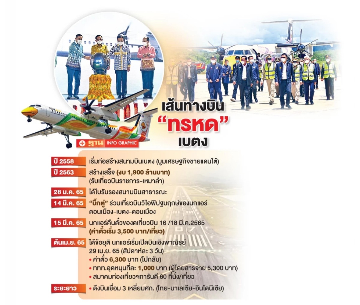 สนามบินเบตง อำเภอใต้สุดของไทย สร้างเสร็จมา 2-3 ปี ท่าม กลางเสียงเรียกร้องให้เปิดเที่ยวบินประจำเชิงพาณิชย์มานาน แต่ก็ไม่ลงตัวเสียที ในที่สุด พล.อ.ประยุทธ์ จันทร์โอชา นายกรัฐมนตรี ร่วมเดินทางเที่ยวบินปฐมฤกษ์ เมื่อ 14 มีนาคม 2564