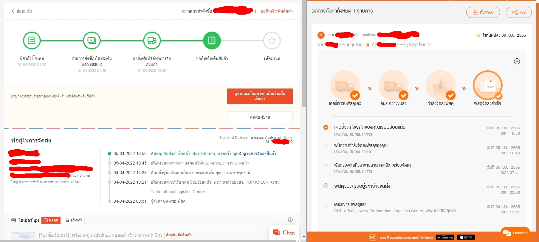 05-04-2022 เวลา 17:46 น. = ทำเรื่องขอคืนเงิน ในแอป Shopee (และพิมพ์ในแชทแจ้ง Shopee ว่า kerry น่าจะส่งของผิด พร้อมแคปหน้าเว็บ tracking ส่งไป)