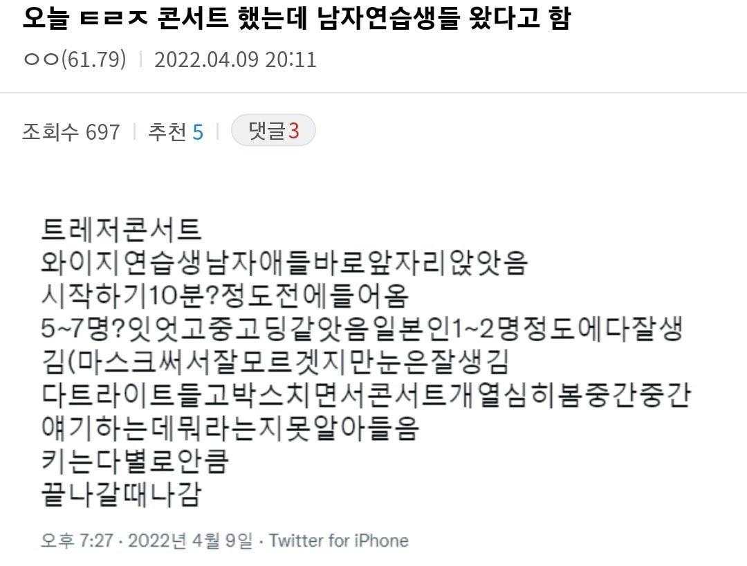 OP: วันนี้ (09/04) มีเด็กฝึกชายของ YG 5-7 คนมาที่คอนเสิร์ตของ TREASURE พวกเขาน่าจะยังอยู่ม.ต้น และม.ปลายกัน แม้จะสวมแมสก์อยู่แต่หล่อทุกคนเลย มีคนญี่ปุ่นประมาณ 1-2 คน พวกเขาโบกแท่งไฟกับปรบมือ และออกไปทันทีหลังจากงานจบ