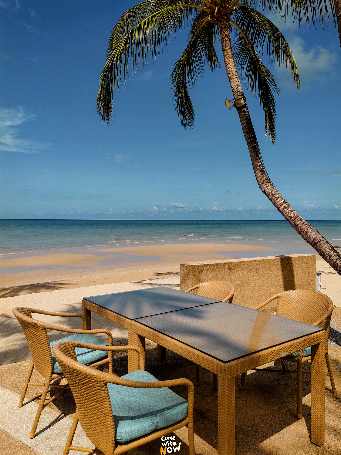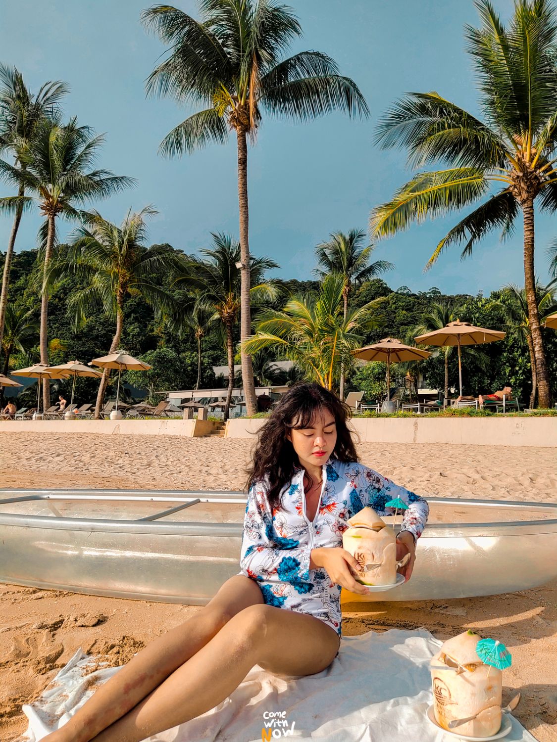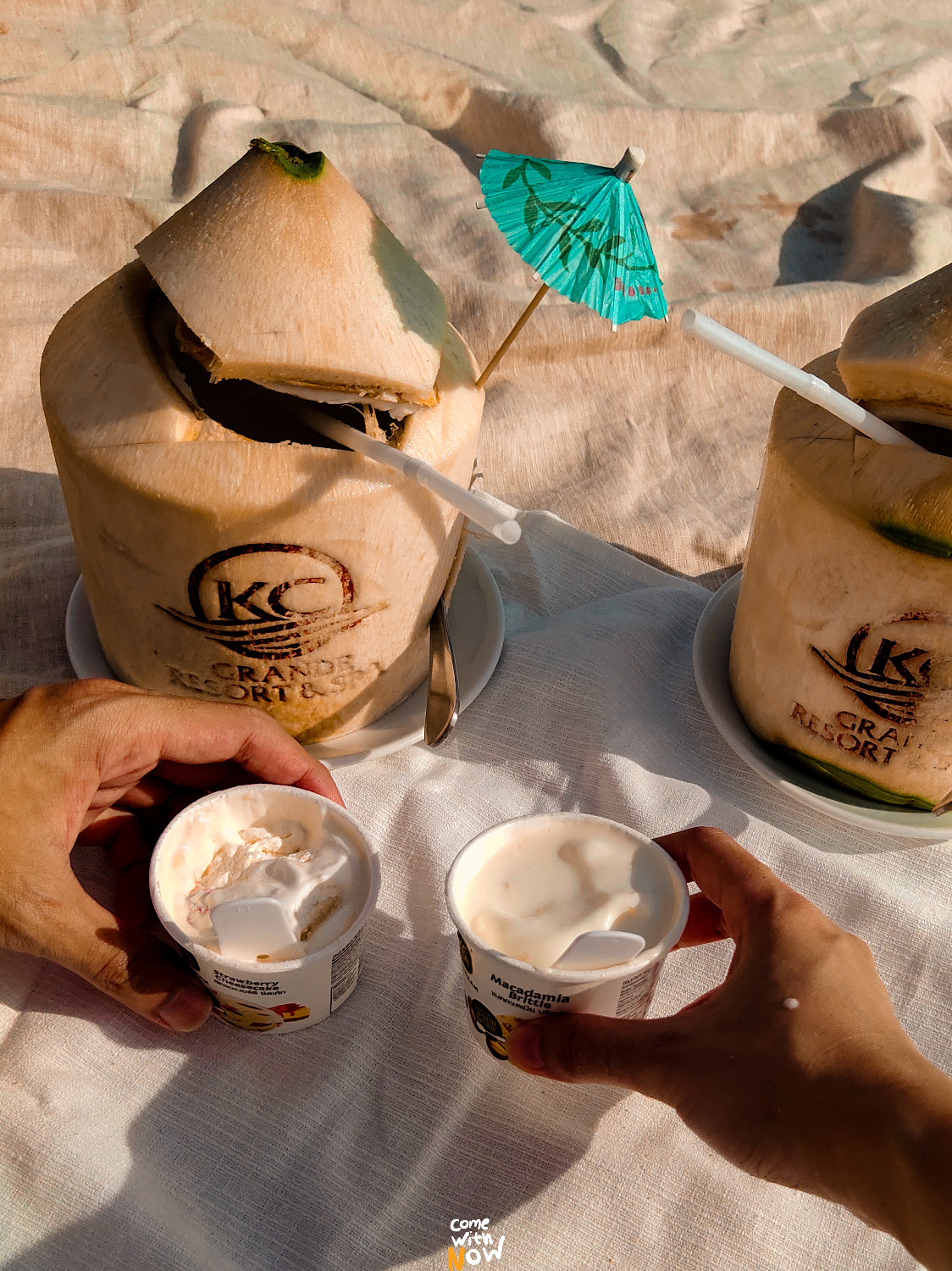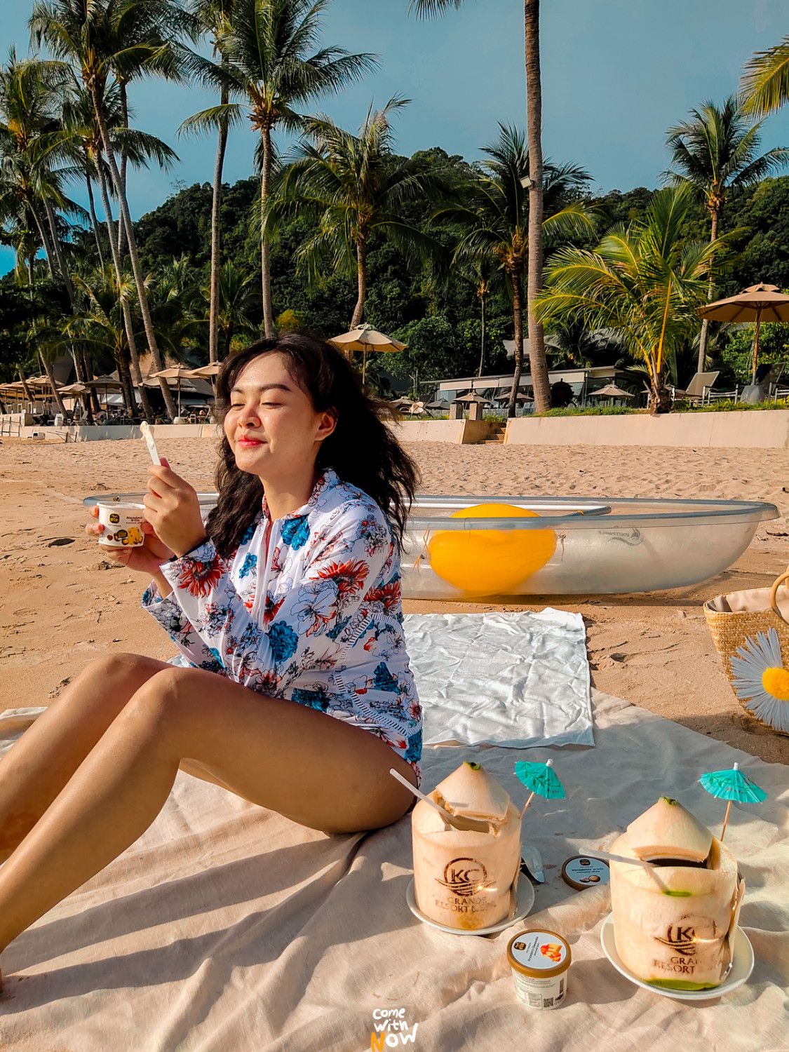 ที่จริงโรงแรมเค้ามีเซ็ทปิดนิกด้วยนะทุกคน ราคา 800.- เราอยากลงไปนั่งบนชายหาดขาวๆ ทรายละเอียดนี้ก็เลยเอาผ้าปิกนิกของตัวเองมาปู สั่งน้ำมะพร้าวกับไอศกรีมมากิน อืมมม นั่งฟินไปถึงเย็น