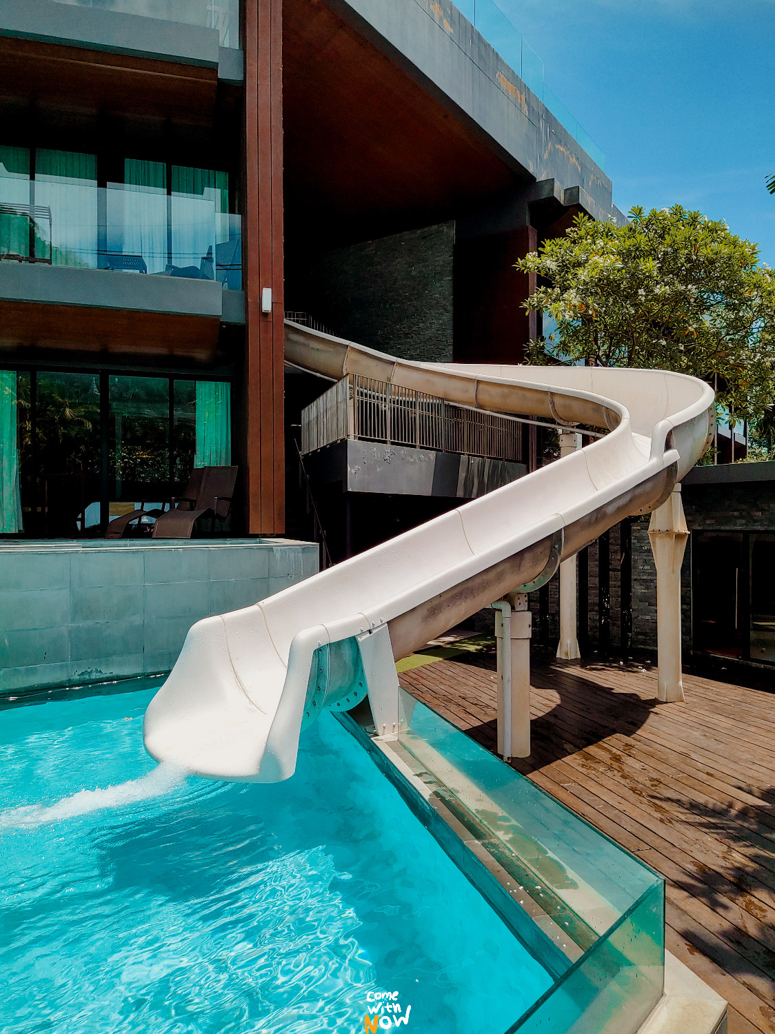 ชั้นล่างเป็นสระว่ายน้ำสองระดับพร้อมสไลเดอร์