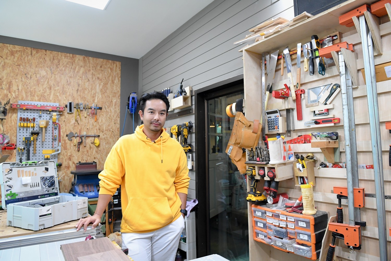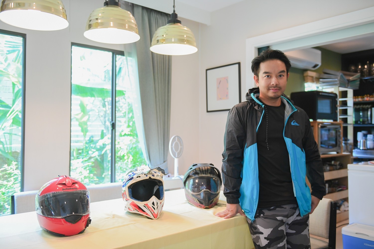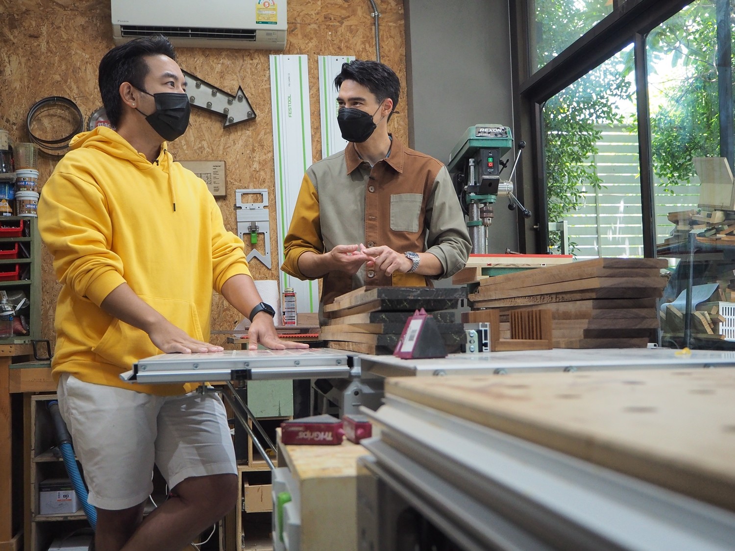 “กิจกรรมในวันนี้จริงๆ มาจากหลายสิ่งหลายอย่างครับ ช่วงสถานการณ์โควิดได้อยู่บ้านทำให้อยากหางานอดิเรกทำ เราก็ไปเรียนจริงจังเลยเกี่ยวกับงานไม้ เริ่มจากลองทำเล่นๆ ชิ้นแรก ตั้งโชว์ลงรูปดันมีคนมาขอซื้อ ติดใจเริ่มสนุกก็เลยเกิดเป็นชิ้นที่สองสามสี่ตามมา พอทำแล้วมันมีทั้งรายได้ และมีทั้งความสุข ก็ทำจริงจังเลยครับ ซึ่งผมรับออกแบบครีเอทงานให้ด้วย เช่นมีชิ้นเดียวในโลก เพราะทำอีกครั้งนึงมันจะไม่เหมือนเดิมแล้วนะครับ (หัวเราะ) และก็สามารถใช้งานได้จริงๆ เปิดเป็นสตูดิโอชื่อ A Dear in the Woods ยังไงลองเข้ามาดูในไอจีได้เลยครับ ส่วนจุดเปลี่ยนอีกเรื่องก็คงเป็นน้ำหวานเองด้วยแหล่ะ พอเขารู้ว่าเรามีงานไม้ทำที่บ้าน ไม่ต้องออกไปซิ่งรถวิบากออกต่างจังหวัดอันตรายเหมือนแต่ก่อน น้ำหวานเขาก็สบายใจ แต่พอเขามาเห็นเราทำงานไม้ชิ้นใหญ่ๆ บางชิ้นสามสี่เมตร เขาก็ยังห่วงๆ อยู่ เพราะมันก็ดูอันตรายไม่แพ้กันเลย แต่อย่างน้อยก็ได้เจอหน้ากันบ่อยขึ้น เพราะจากห้องนอนก็ลงมาทำงานด้านล่างได้เลย ส่วนกิจกรรมดำน้ำ เวลาออกทริปผมจะไปคนเดียว แล้วต้องหายจากโลกนี้ไปเป็นอาทิตย์ กลับมารอบนี้ จึงเทรนน้ำหวานเพื่อจะได้ไปออกทริปด้วยกัน เขาไปด้วยจะได้ไม่มีปัญหาครับ”