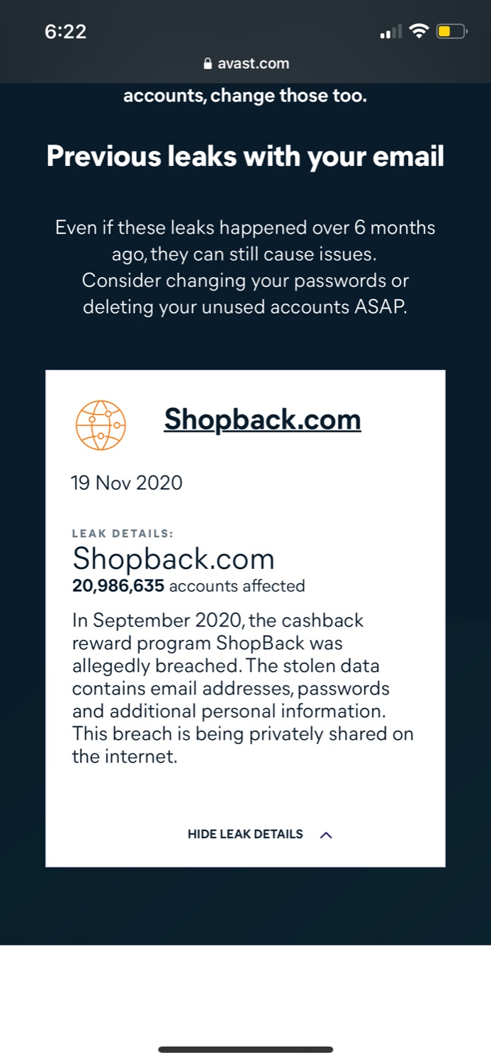 เข้าไปเช็คEmail leak กันได้ทาง เว็บไซต์ของ Avast นะ https://www.avast.com/hackcheck#ios เสร็จแล้วผลจะส่งเข้ามาทางอีเมลค่ะ