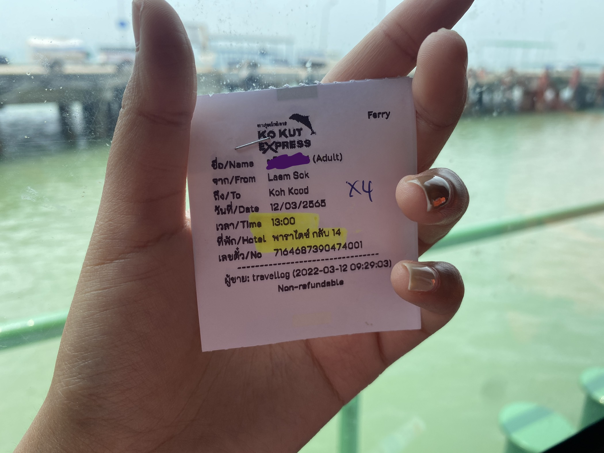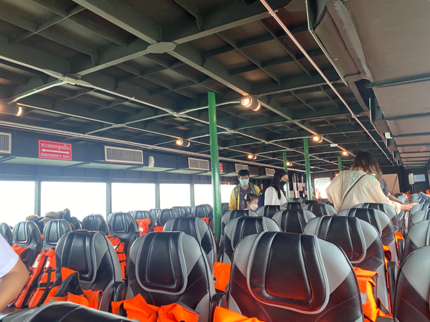 ตอนขึ้นเรือก็แสดงตั๋วที่ได้รับมา ซึ่งเราจะได้ตั๋วขาไปกับขากลับแยกกัน แต่ละอันจะมี 2 ส่วน พนักงานจะฉีกส่วนหนึ่งเก็บไว้ แล้วให้อีกส่วนเราคืนกลับมา