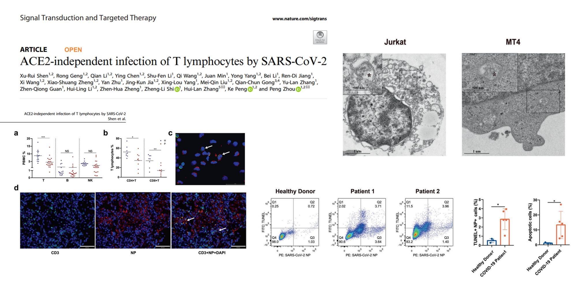 งานวิจัยชิ้นหนึ่งที่ตีพิมพ์ออกมาจากทีมวิจัยจากประเทศจีนระบุว่าไวรัส SARS-CoV-2 สามารถติดเข้าสู่เซลล์เม็ดเลือดขาวชนิด T cell ได้ และ เซลล์ที่ติดเชื้อไวรัสจะถูกเหนี่ยวนำให้ทำลายตัวเอง และ ตายไปในที่สุด ซึ่งอาจเป็นกลไกที่อธิบายว่าเหตุใดในผู้ป่วยโควิดอาการหนักหลายรายมีปริมาณของเม็ดเลือดขาวที่ลดลง (Lymphopenia) งานวิจัยนี้ได้แสดงผลการทดลองที่ค่อนข้างชัดว่า ไวรัสสามารถติดเข้าสู่เซลล์เม็ดเลือดขาวชนิด T cell ได้ โดยเฉพาะเม็ดเลือดขาวที่อยู่สภาวะที่ถูกกระตุ้นพร้อมแบ่งตัว (activated T cell) โดยกลไกการเข้าสู่เซลล์จะแตกต่างจากเซลล์ปกติทั่วไป เพราะไวรัสไม่ได้ใช้โปรตีน ACE2 เป็นโปรตีนตัวรับ แต่ดูเหมือนจะใช้โปรตีนตัวอื่นชื่อว่า LFA-1 แทน ซึ่งงานวิจัยนี้ยังไม่ได้ลงรายละเอียดว่าไวรัสใช้สไปค์จับกับโปรตีนตัวนี้โดยตรง หรือ อาศัยกลไกอื่นที่ไม่ได้ใช้โปรตีนหนามสไปค์โดยตรงหรือไม่