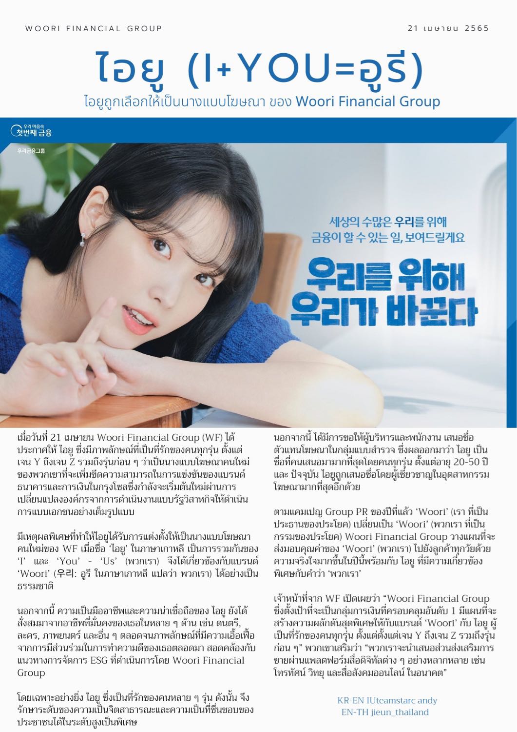 [IU] ไอยู ได้รับเลือกให้เป็นพรีเซ็นเตอร์ของ Woori Financial Group กลุ่มสถาบันการเงินที่ใหญ่ที่สุดในเกาหลีใต้🇰🇷💵