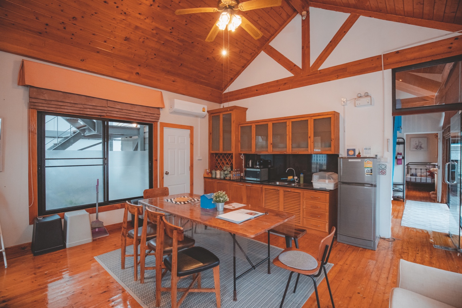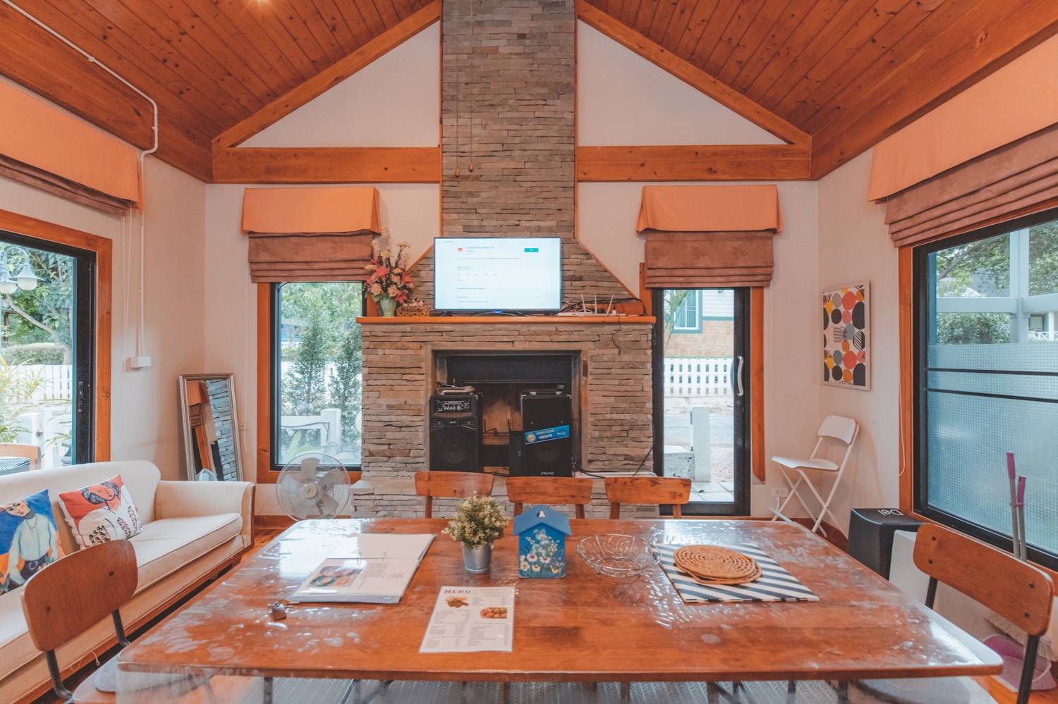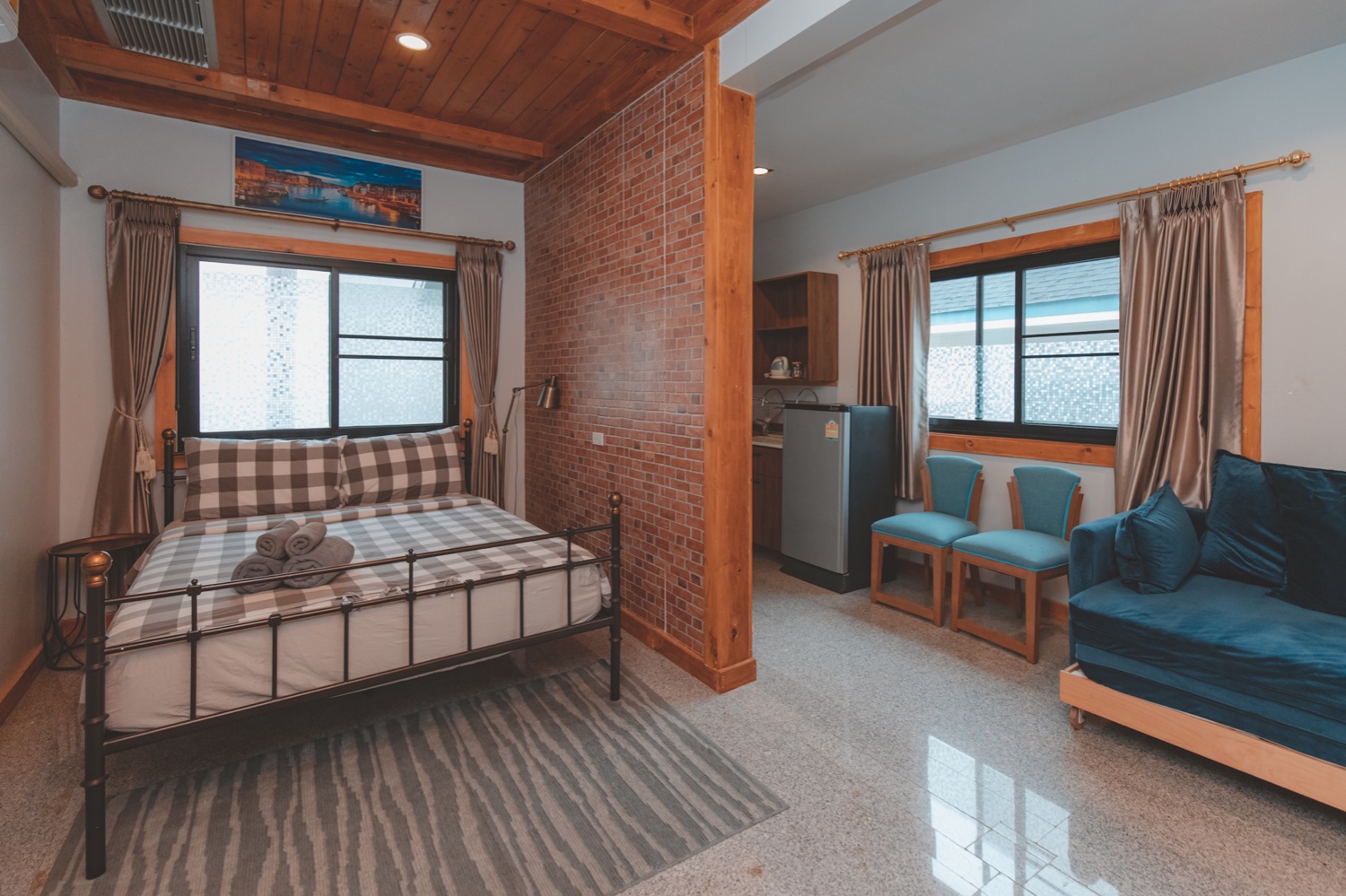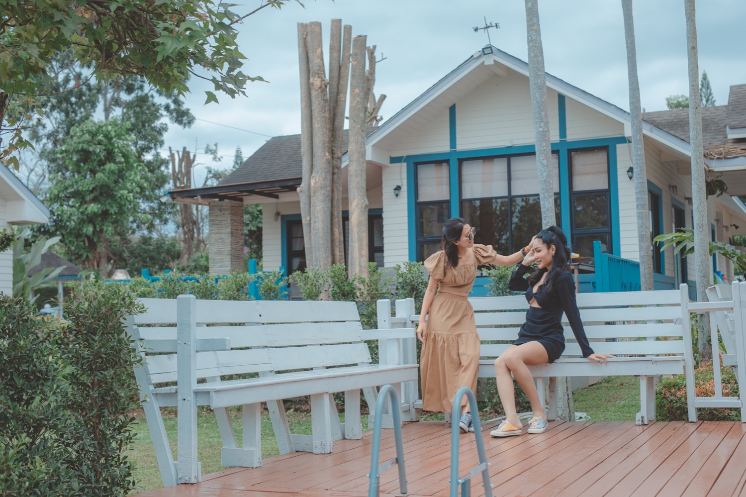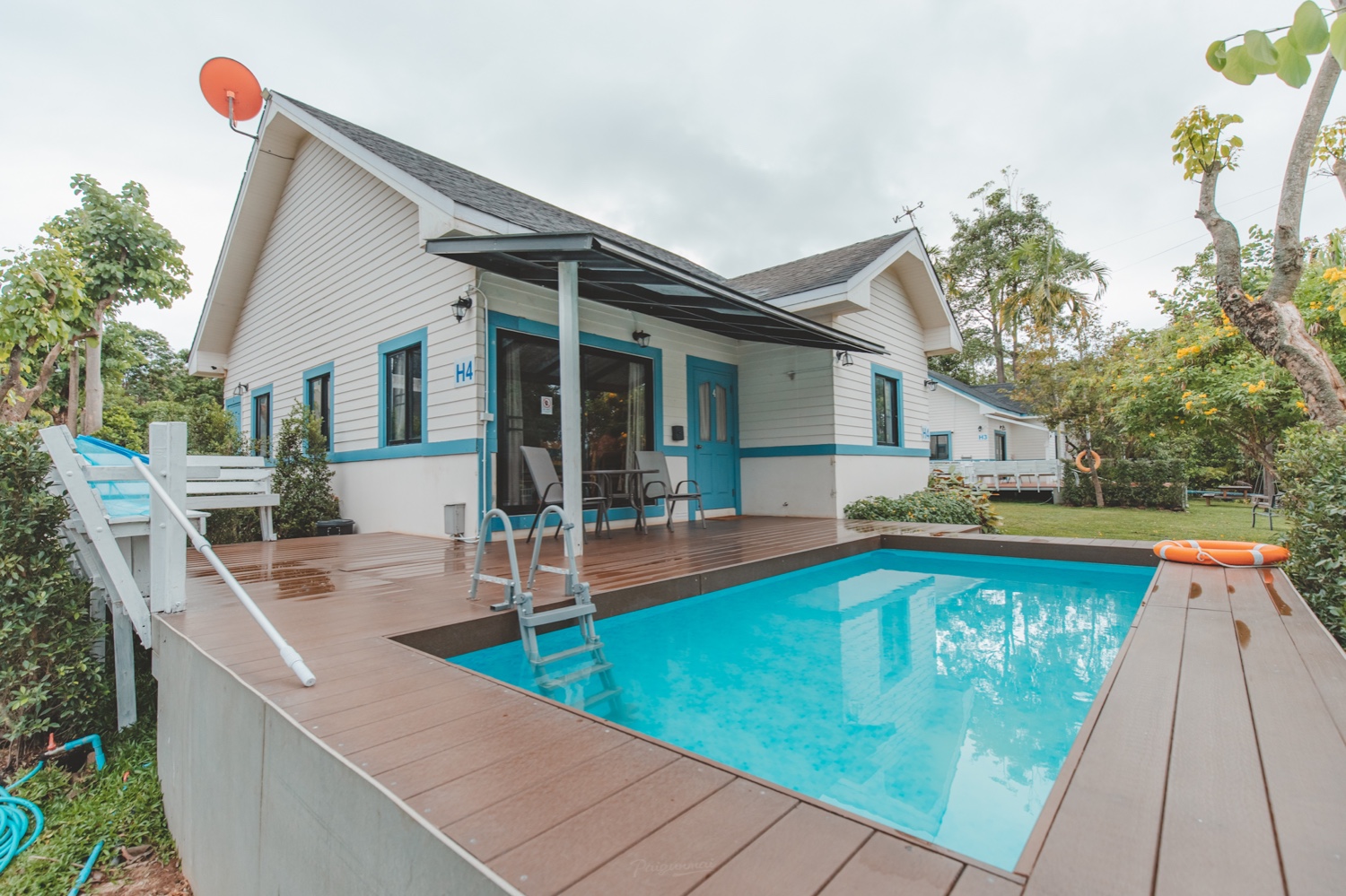 บ้านพักที่นี่จะเป็นแนวคันทรี่นะคะ เน้นการตกแต่งด้วยไม้และโทนฟ้าขาว