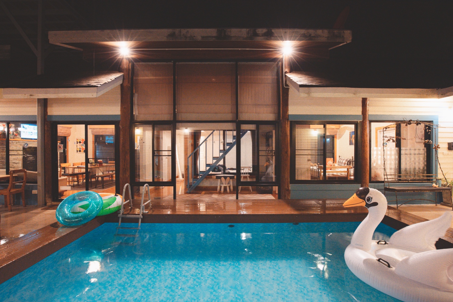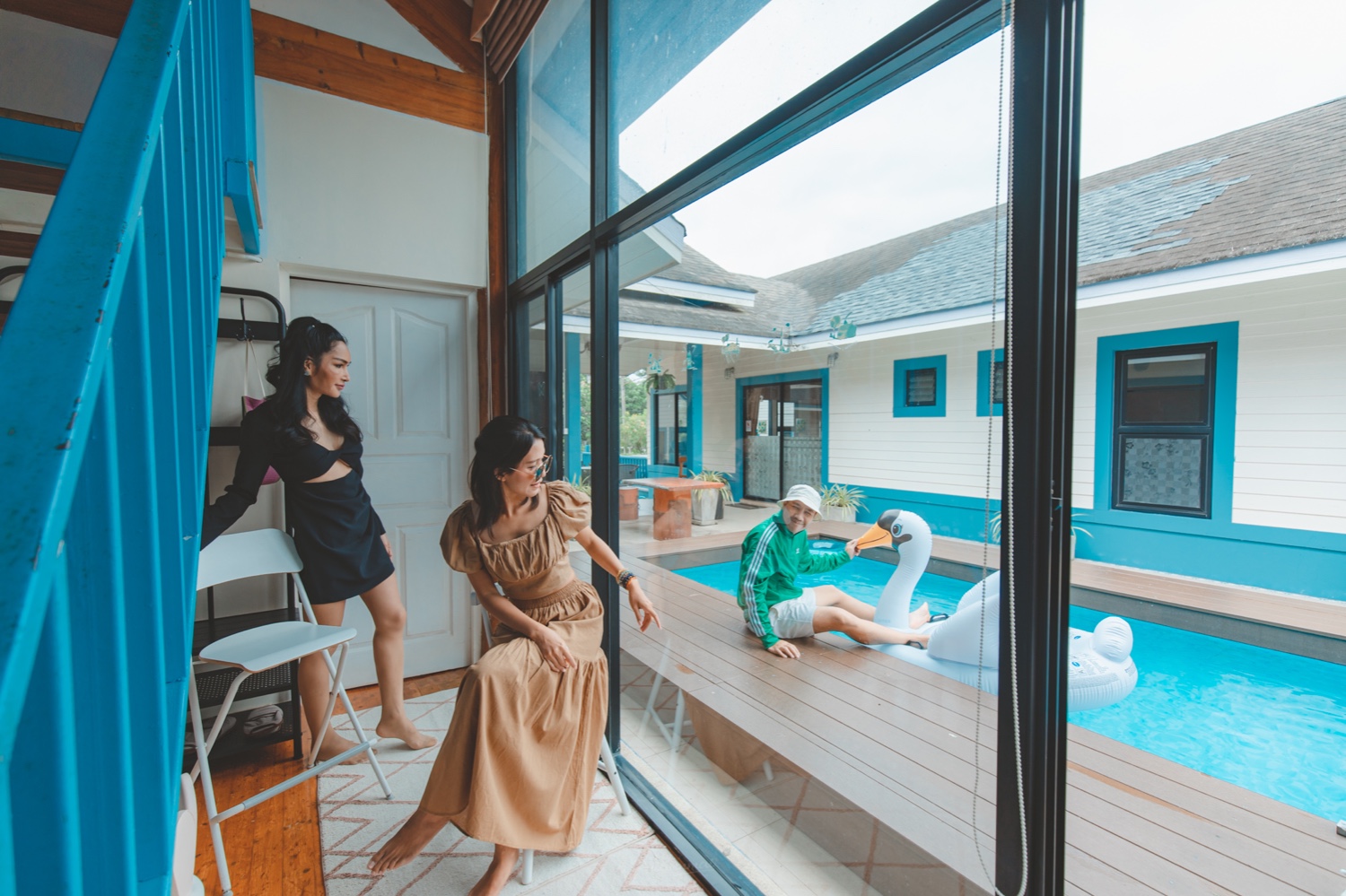 ตัวบ้านจะเป็นกระจกบานใหญ่รอบๆนะคะ สามารถมองออกไปเห็นวิวสระว่ายน้ำได้เลย