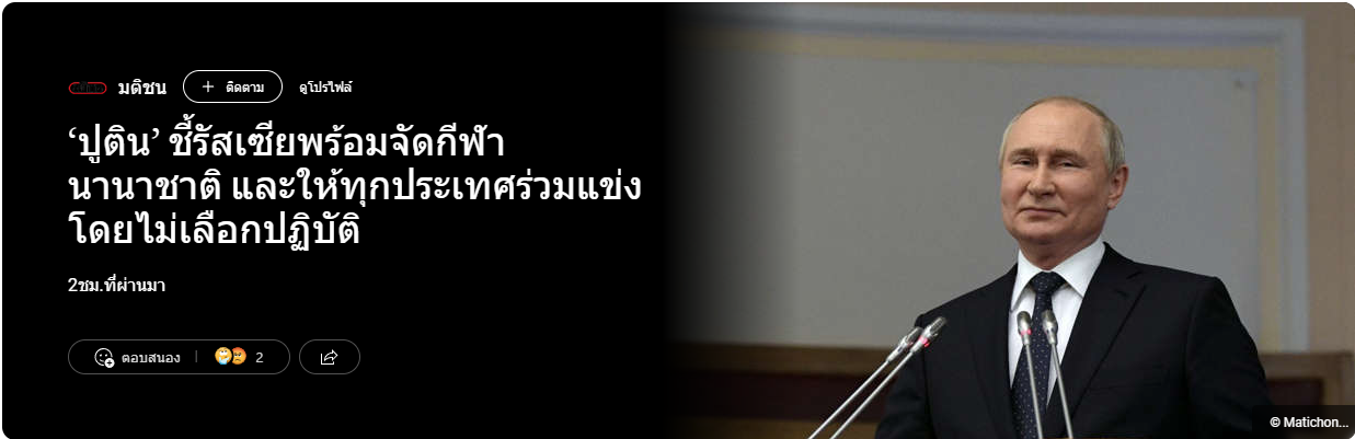 'ปูติน' ชี้รัสเซียพร้อมจัดกีฬานานาชาติ และให้ทุกประเทศร่วมแข่งโดยไม่เลือกปฏิบัติ (matichon.co.th)