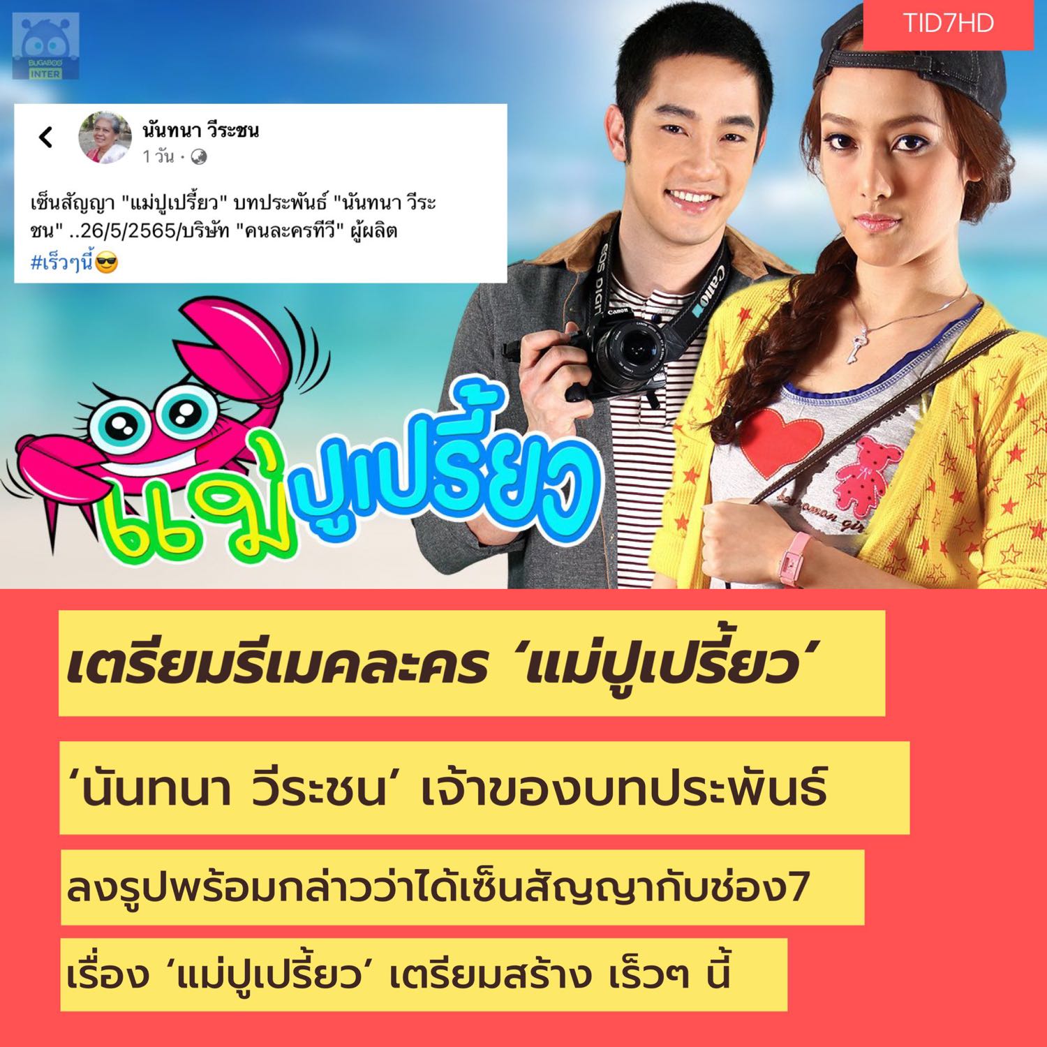 เฟซบุ๊กของนักเขียนชื่อดัง #นันทนาวีระชน ได้อัพเดตข้อมูลว่า ได้เซ็นสัญญาลิขสิทธิ์บทประพันธ์เรื่อง #แม่ปูเปรี้ยว กับ #ช่อง7HD แล้ว โดยน่าจะรีเมคเร็ว ๆ นี้