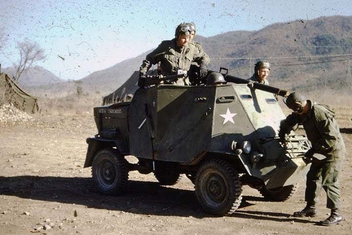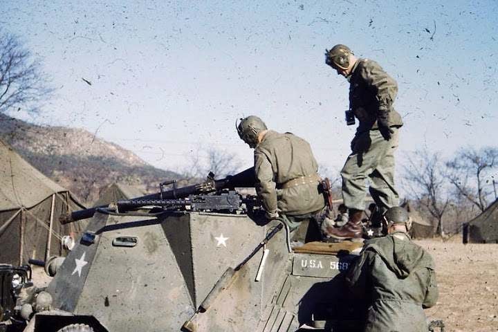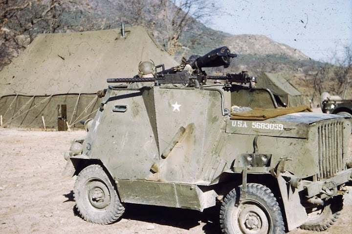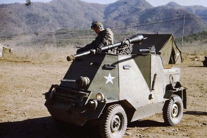 รถ Jeep หุ้มเกราะทำเองติดปืนไร้แรงสะท้อนถอยหลัง M20 กับปืนกล M1919 สามกระบอกของกรมทหารราบที่ 17 กองทัพสหรัฐซึ่งประจำการอยู่ที่หุบเขาคุมวาปี 1952 สงครามเกาหลี