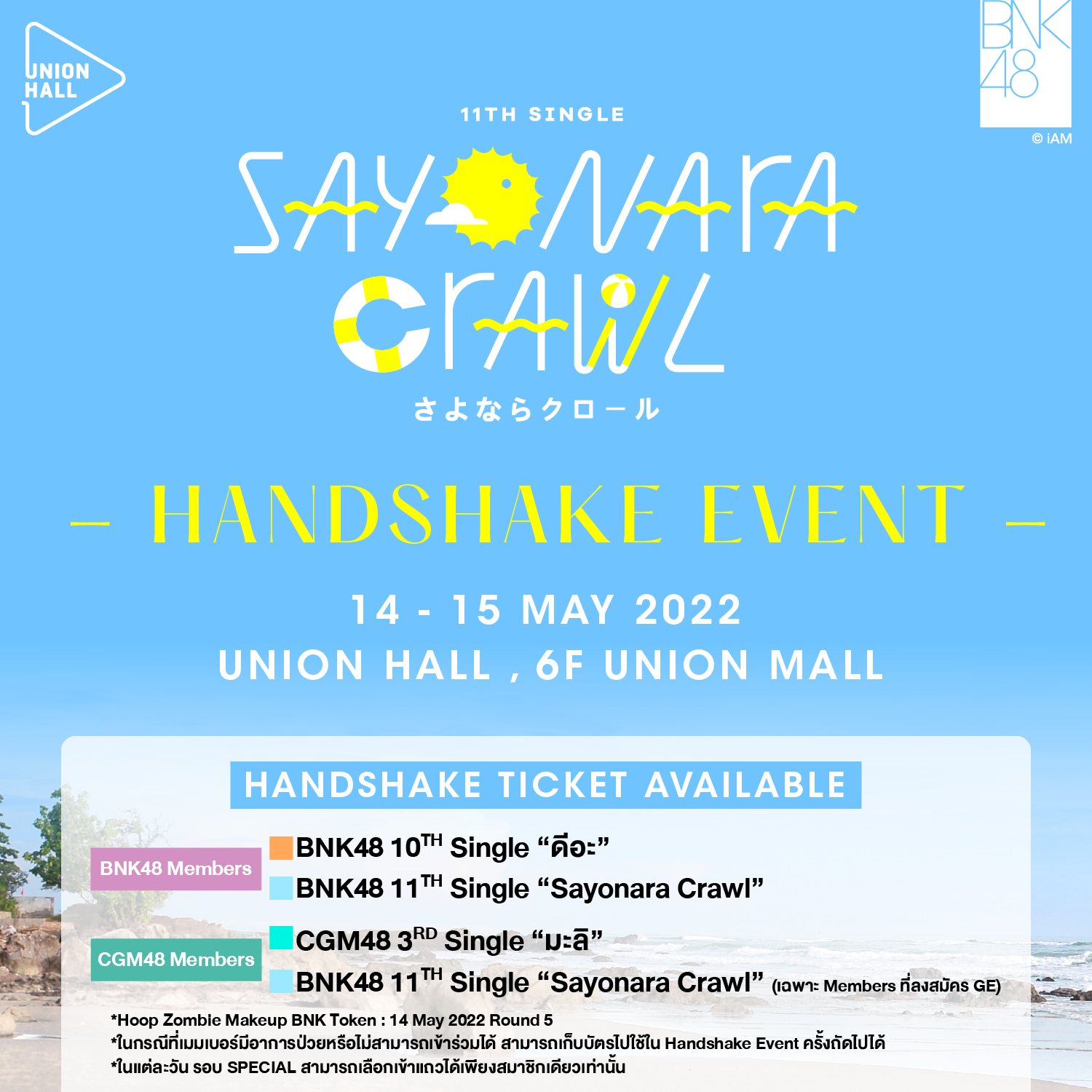 BNK48 11th Single “Sayonara Crawl” Handshake Event 14-15 พฤษภาคม 2022 @ Union Hall, 6F Union Mall โปรดตรวจสอบรายละเอียดของมาตรการในการเข้าร่วมงานและปฏิบัติตามอย่างเคร่งครัด (1) BNK48 10