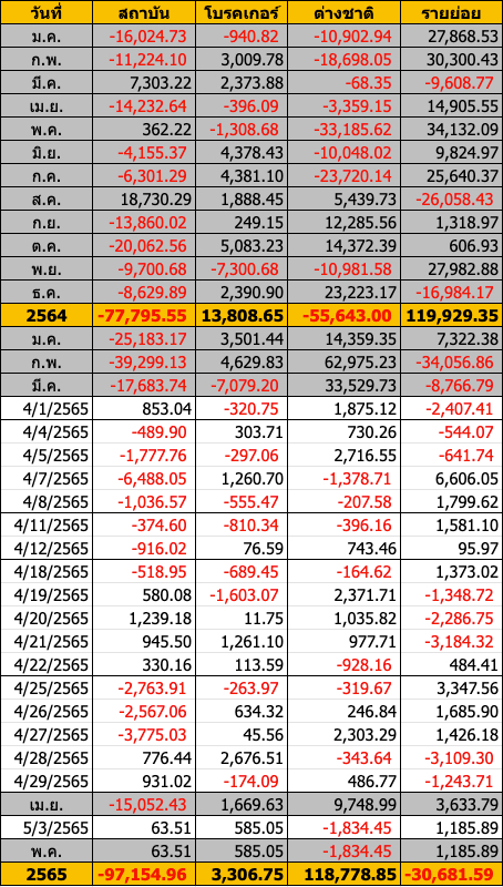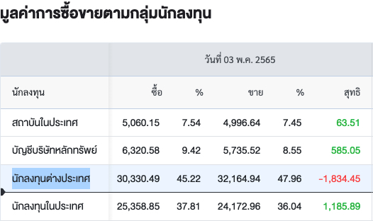 Sinthorn Summary 3/5/2565 : ต่างชาติขายสุทธิ -1,834.45 ลบ.