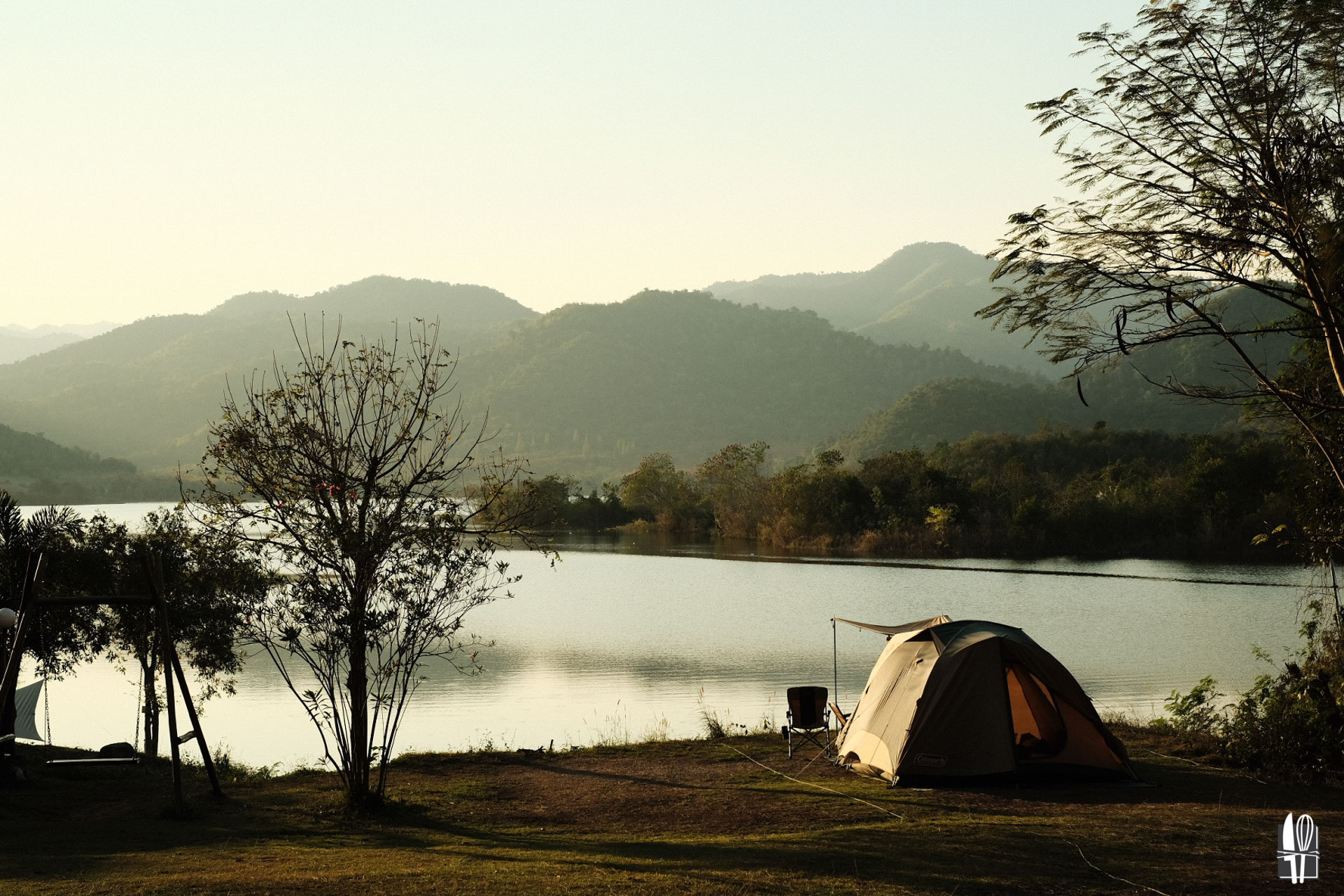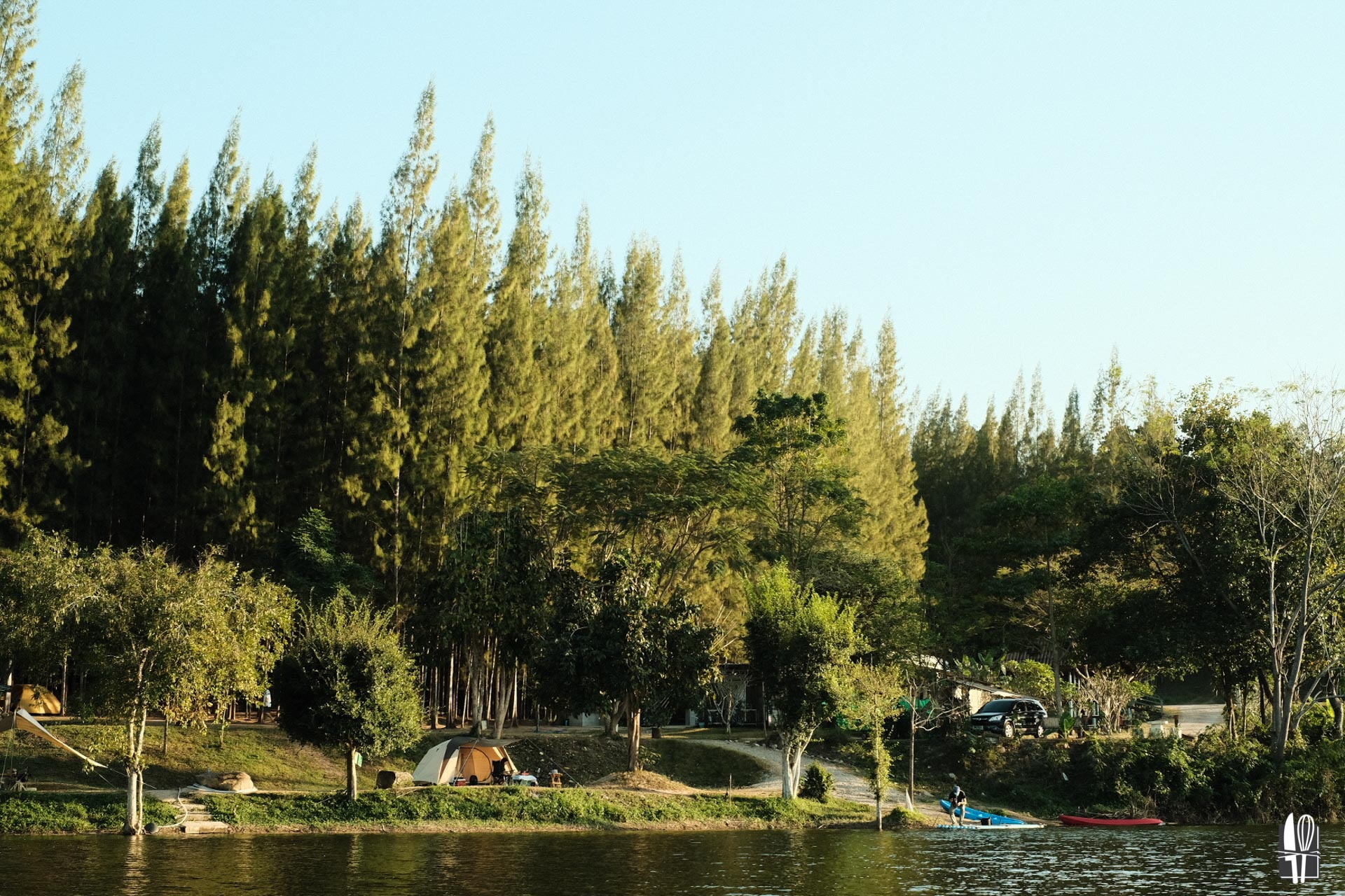 โซนตั้งแคมป์มี 3 โซน คือบริเวณริมน้ำ ส่วนสนามหญ้า และส่วนต้นยาง เราเลือกส่วนต้นยางเพราะเป็นส่วนที่มีร่มเงาช่วยบังแดดตอนกลางวันได้ดี แถมถ่ายรูปมาดูเท่ดี ใครชอบวิวสวยๆ ก็แนะนำโซนริมนำ เป็นพื้นที่เล็กๆ ที่กางเต๊นท์ได้ไม่กี่เต็นท์ เหมาะมากถ้าชอบความสงบ