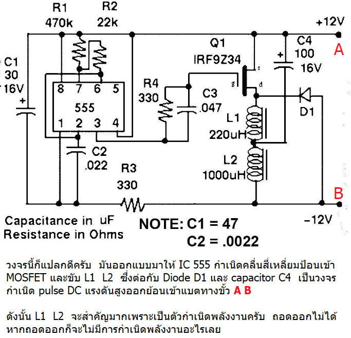ผมรู้ว่าส่วน IC555 ทำหน้าที่สร้างภาคความถี่ ไปควบคุมมอสเฟตQ1 ให้ตัดต่อวงจรเป็นสวิตต์อัตโนมัติ แต่วงจรนี้ทำไมไม่มีแหล่งจ่ายภาคนอกมาจ่ายไฟเข้าให้แบตเลย แล้ว L1 L2 ถ้าถอดออกจะใช้งานได้ไหมครับ