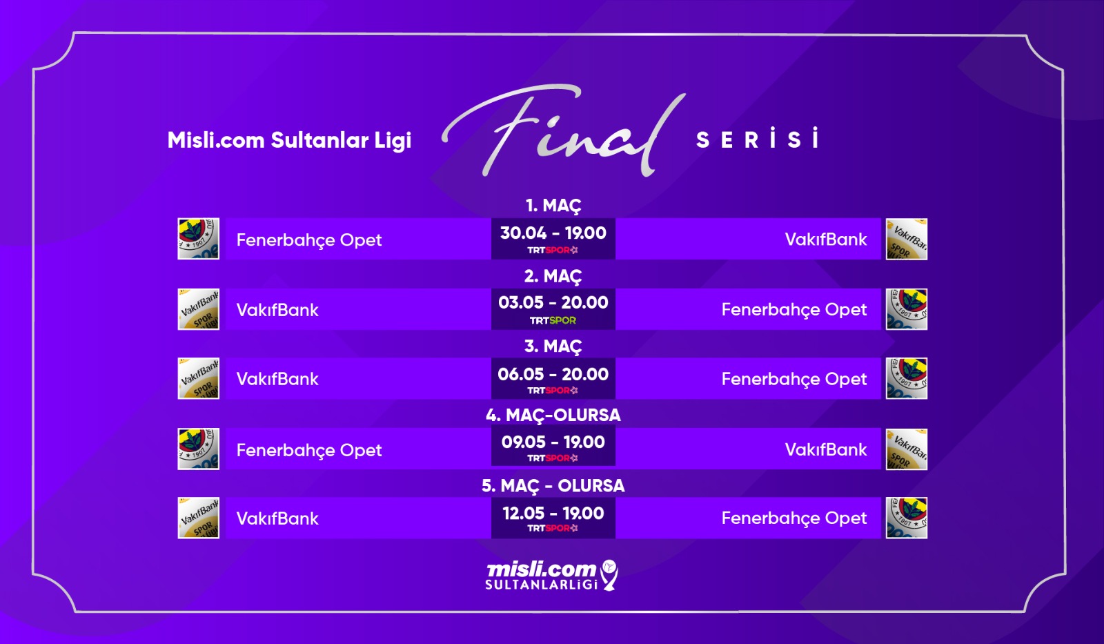 โปรแกรมการแข่งขัน 🥇 Gold Medal Match 🥇 🥇 Match 4 🥇 เวลา 23.00 น. FENERBAHÇE OPET vs. VAKIFBANK ช่องทางการรับชม : https://www.youtube.com/c/trts
