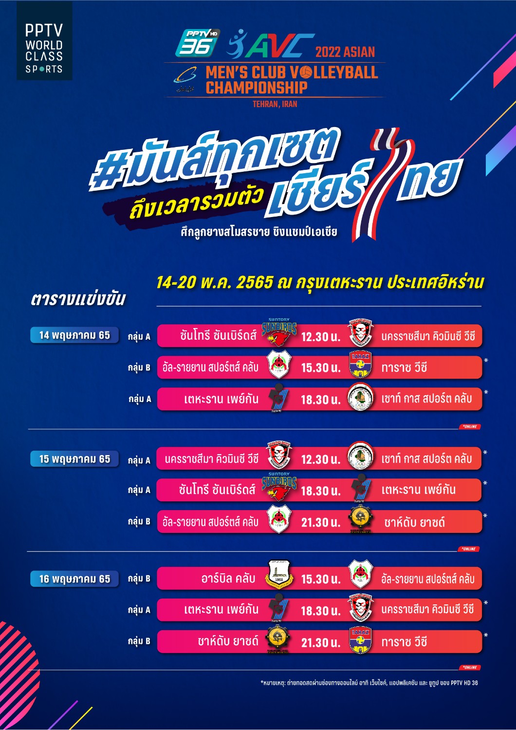 พีพีทีวี จัดเต็มให้สมกับการรอคอย เตรียมยิงสดเกมลูกยางสโมสรอันดับหนึ่งของเอเชียที่ส่งตรงจากประเทศอิหร่านกลับมาให้คอกีฬาชาวไทยได้รับชมกันแบบจุใจทุกวัน ประเดิมด้วยคู่ SUPER MATCH นัดเปิดสนามในวันเสาร์ที่ 14 พฤษภาคม นี้ เวลา 12.30 น. เป็นการพบกันระหว่าง สโมสรซันโตรีซันเบิร์ดส์ (ญี่ปุ่น) พบ สโมสรนครราชสีมา คิวมินซี วีซี (ไทย) โดยจะออกอากาศให้ได้ชมผ่านทางหน้าจอช่อง 36 และช่องทางออนไลน์ เวลา 15.30 น. สโมสรอัล-อาราบี สปอร์ตส์ คลับ (กาตาร์) พบ สโมสรทาราซ วีซี (คาซัคสถาน) เวลา 18.30 น. สโมสรเพย์กัน เตหะราน (อิหร่าน) พบ สโมสรเซาท์ กาส สปอร์ต คลับ (อิรัก) ทั้ง 2 คู่จะถ่ายทอดสดผ่านช่องทางเว็บไซต์ แอปพลิเคชัน และยูทูบ “PPTV HD 36”