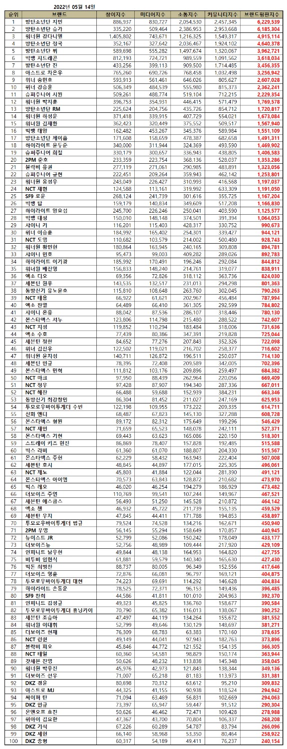 และทั้งหมด 100 อันดับชื่อเสียงรายบุคคลบอยกรุ๊ปประจำเดือนพฤษภาคม 2565 ได้แก่