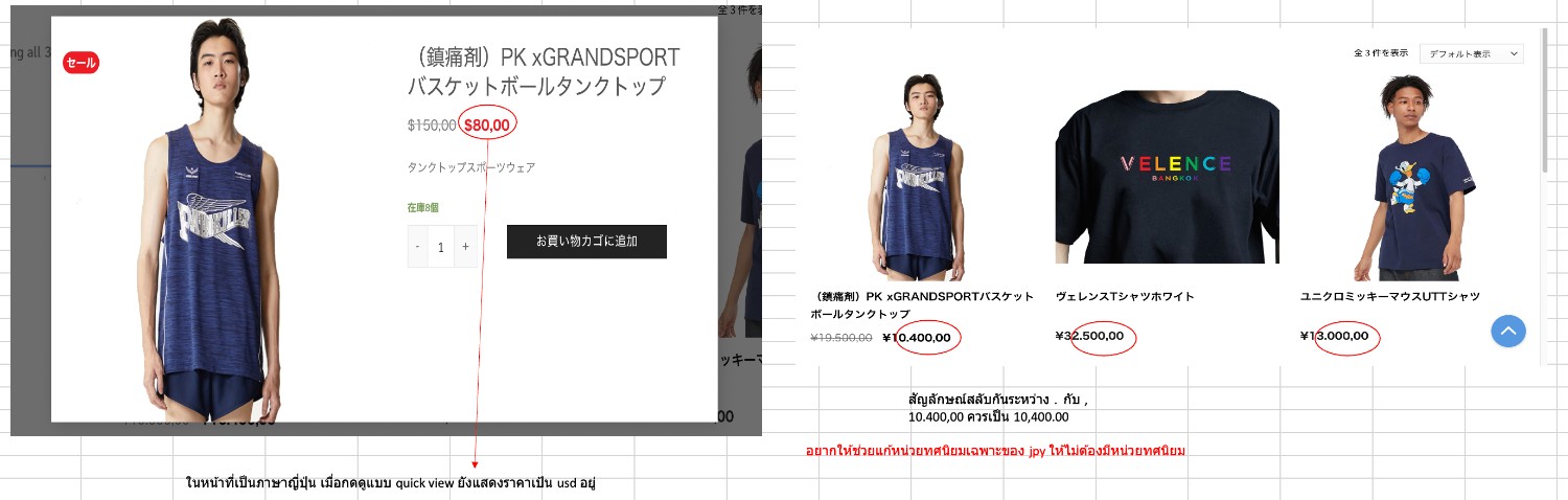 1. ตอนเป็น EN แสดงราคาไม่มีปัญหาอะไร แต่พอเปลี่ยนเป็น JP ราคาที่หน้าโชว์สินค้าเป็น JPY ก็จริง แต่เมื่อกดดู quick view ราคายังเป็น USD อยู่