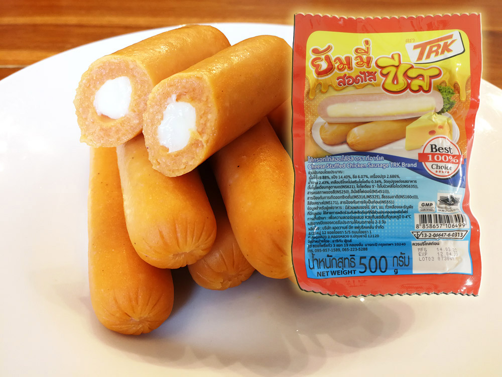 ต่อไปที่วางอยู่ข้างกัน และดูน่าสนใจก็คือ #ไส้กรอกชีส #TRK ตัวนี้เป็น #ไส้กรอกไก่ เห็นหลายๆคนบอกว่าตัวนี้เวลากินจะ #ชีสทะลัก ก็มาดูกันครับ ว่าจะทะลักมากน้อยแค่ไหน ไส้กรอกนี้ #มีจำหน่ายตลาดสด หาซื้อได้ง่ายเช่นเดียวกันครับ ราคาไม่แพง