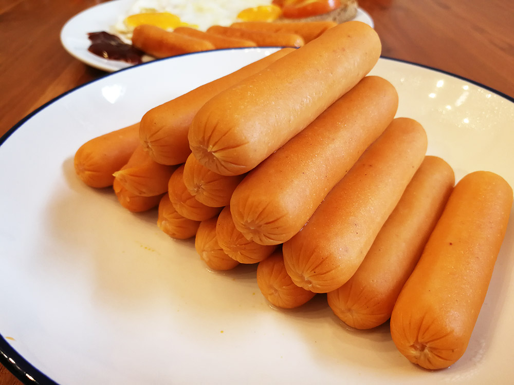 ไส้กรอกตัวนี้ผมจะทำให้ดู 2 แบบ ทั้งการลวก และการทอดครับ เริ่มต้นเอามาลวก ได้เนื้อสัมผัสที่ นุ่มเด้ง กำลังดีครับ สีสรรถือว่า ดูเป็นธรรมชาติแบบไส้กรอกไก่ ไม่สดจนเกินไป ถือว่าดีครับ การที่เราใช้การลวก เมื่อจัดเสริฟ ผิวไส้กรอกจะดูสวยงาม ไม่เกิดการย่นเมื่อทิ้งไว้นาน คล้ายๆไส้กรอกที่อยู่ในไลน์บุ๊ปเฟ่ของโรงแรมครับ