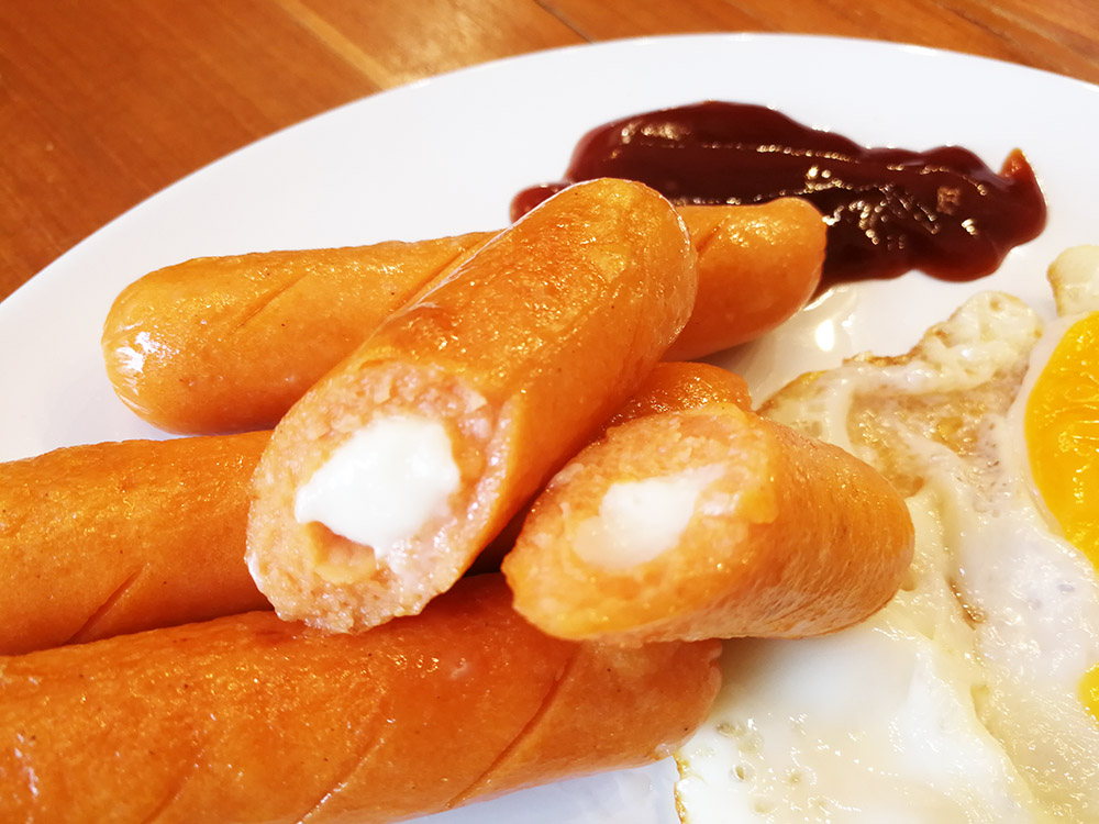 เมนูถัดไป ลองเอามาทอดในกระทะบ้าง เพื่อทำเมนู Breakfast แบบฝรั่ง ไส้กรอก ไข่ดาว ขนมปัง กินมื้อเช้า กำลังดีเลยทีเดียวครับ เมื่อนำมาทอด ตัวนี้จะยังคงให้รสสัมผัสออกไปทางนุ่มเช่นเดิมครับ อาจมีหอมขึ้นนิดจากการที่ได้สัมผัสน้ำมันตอนทอด เมื่อทอดแล้วอยากให้รีบรับประทานในทันที ถ้าทิ้งไว้นานๆผิวไส้กรอกอาจจะย่นลงได้เล็กน้อยครับ แต่ถือว่ายังคงอร่อยเช่นเดิม