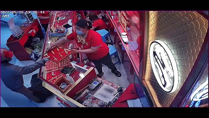 ที่เกิดเหตุพบเจ้าหน้าที่ขายทองเป็นผู้หญิงอยู่ในชุดสีแดงมีอาการตื่นตกใจ พร้อมเล่าเหตุการณ์ให้เจ้าหน้าที่ฟัง และเปิดกล้องวงจรปิดตรวจสอบ พบคนร้ายมาคนเดียว ใช้รถจักรยานยนต์ยี่ห้อยามาฮ่า ออโตเมติก สีขาว ไม่ติดแผ่นป้ายทะเบียน มีตำหนิรูปพรรณรูปร่างผอมสูง สวมเสื้อคลุมแขนยาวสีเทา กางเกงขายาวสีน้ำตาล ถุงมือผ้าสีขาว สวมหมวกกันน็อกสีแดงแบบครึ่งใบ บนหมวกมีสติ๊กเกอร์สีขาวคาดเป็นกากบาท
