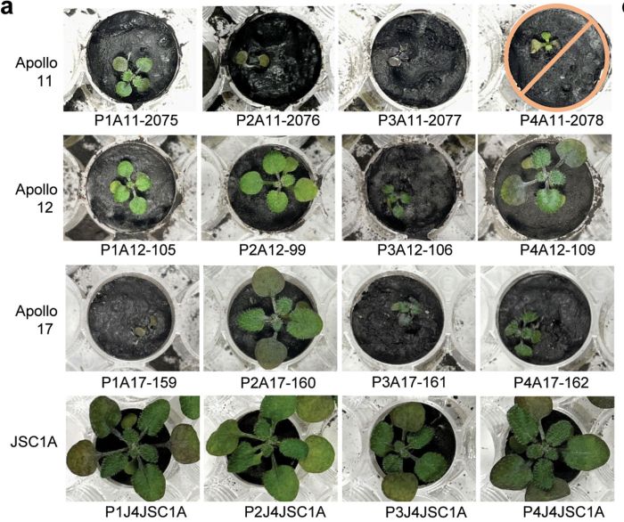 พืชในดินของดวงจันทร์ถูกเปรียบเทียบกับกลุ่มพืชควบคุมที่ปลูกในเถ้าภูเขาไฟ และดินจำลองที่เรียกว่า JSC-1A
