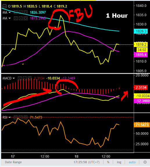 ที่จะดันให้MACDขึ้นเหนืออเส้น0ได้ จบคาบ1ชม.นั้นจึงไหลลงเลย