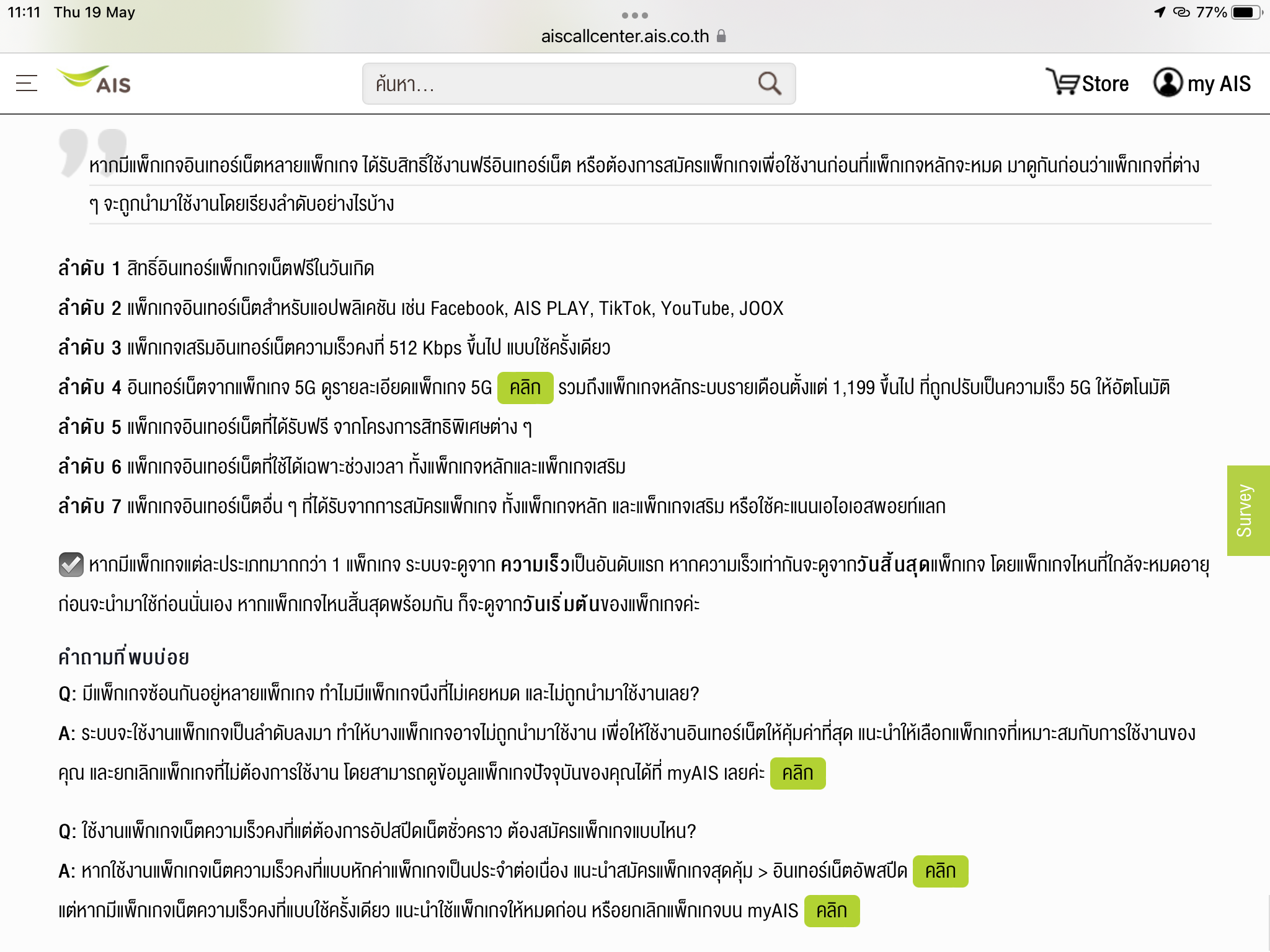อ่านตามนี้เราเข้าใจว่าเน็ตหลักของเราตรงกับลำดับที่ 7และแพ็คเสริมที่เราซื้อเพิ่มตรงกับลำดับที่ 6 หรือ ลำดับ 3 (ไม่แน่ใจ แต่น่าจะในสองอันนี้แหละ) ซึ่งควรจะตัดเน็ต 15 วันก่อน ก็เลยสมัครไปเห็นราคาดีแต่พอใช้งานไปแล้วเข้าไปดูใน app myAIS ตอนนี้มีแต่เน็ตหลักเราที่โดนตัดการใช้งาน เน็ตเสริมอยู่เต็มครบเลยและหมดอายุก่อนจะครบรอบเดือนเน็ตหลักเราด้วย
