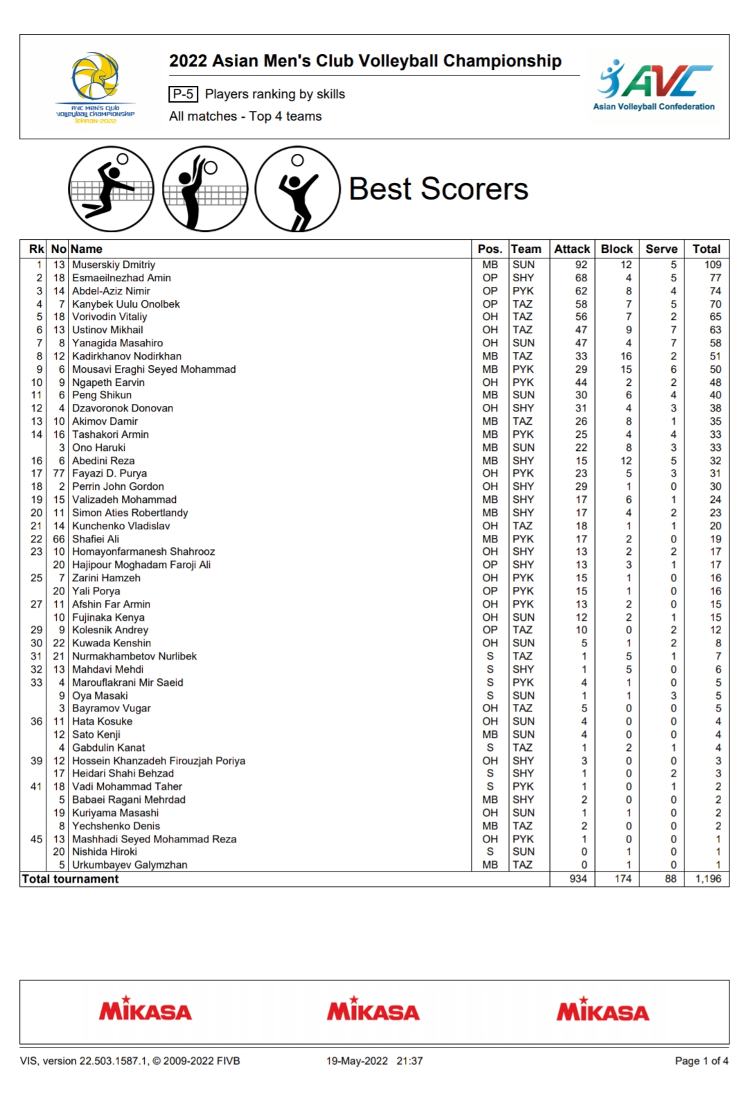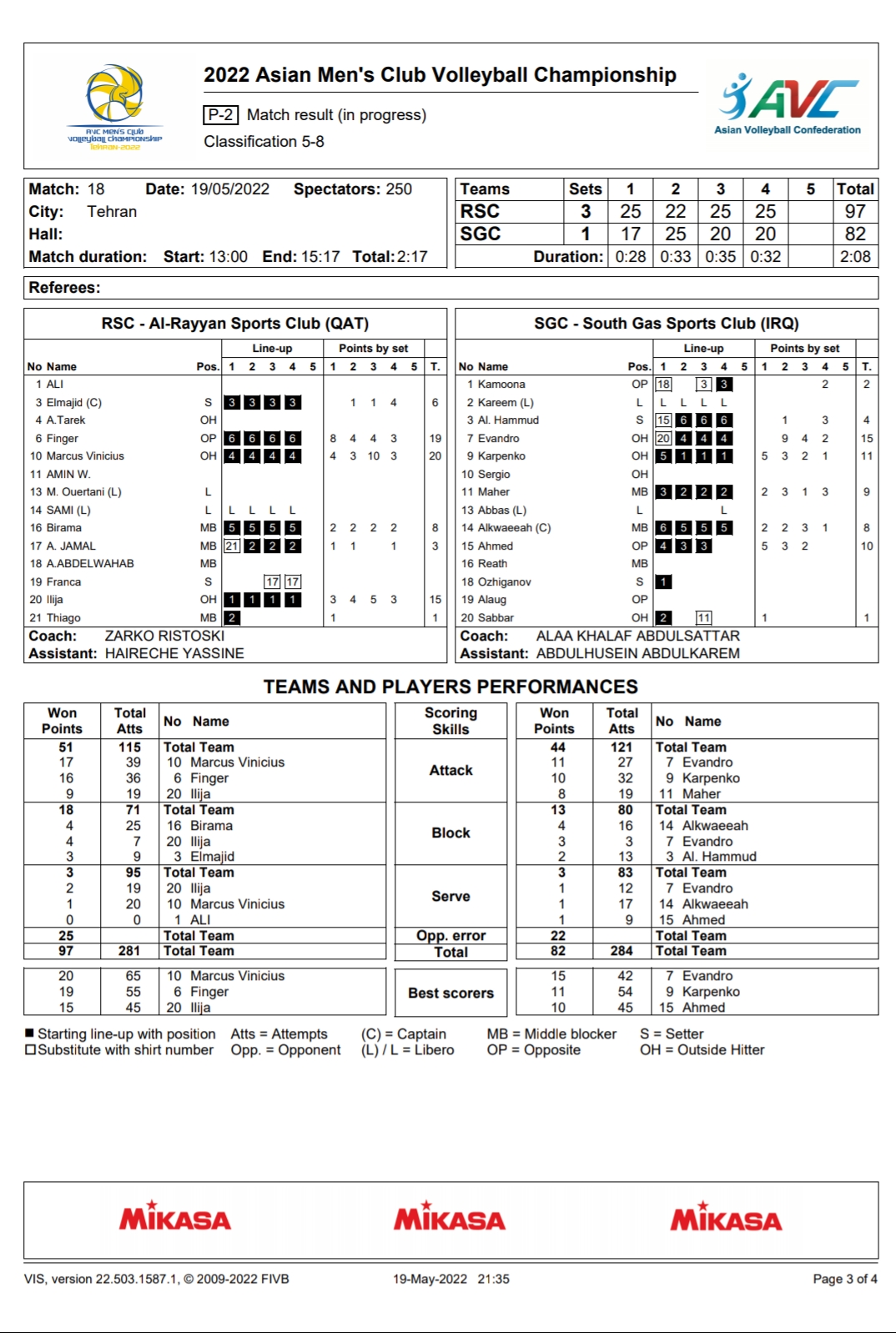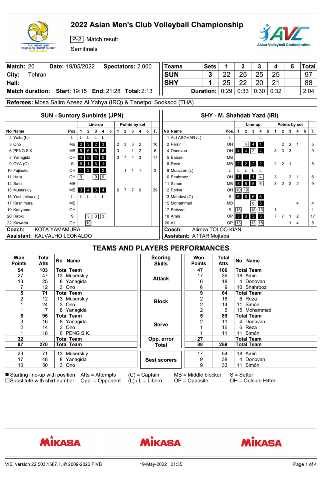 ใบสถิติสโมรชายชิงแชมป์เอเชีย 19/05/2022