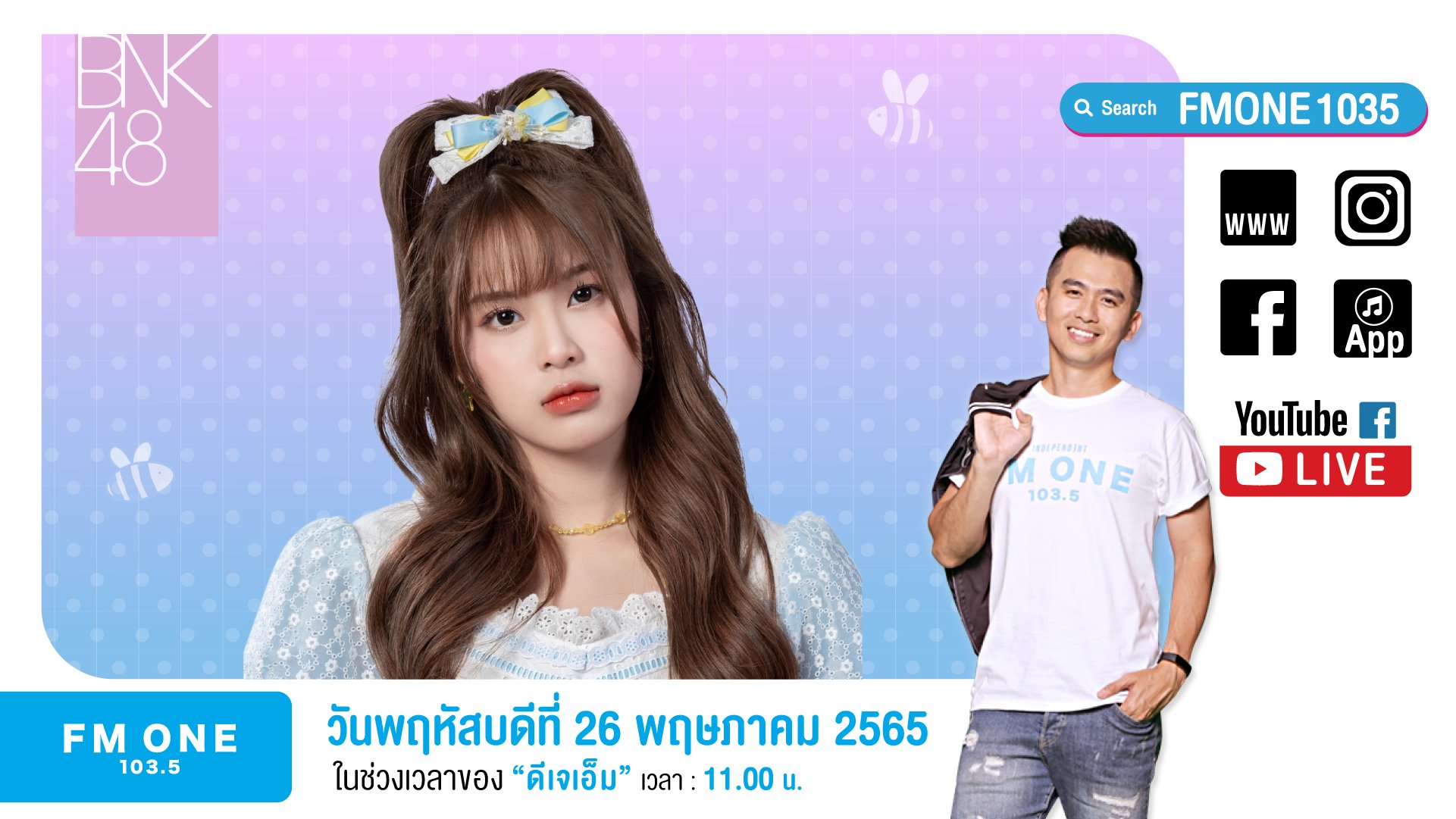 พฤ. 26 พ.ค. 65 (พรุ่งนี้) ในช่วงของดีเจเอ็ม 11.00 น. โมบายล์ BNK48 จะมาพูดคุยงานประกาศผล และผลงานภาพยนตร์ อย่าลืมมารอพบกับโมบายล์กันเยอะๆ น้า เจอกันได้ที่ FB/YT FM ONE 103.5 และฟังผ่านหน้าปัดวิทยุ