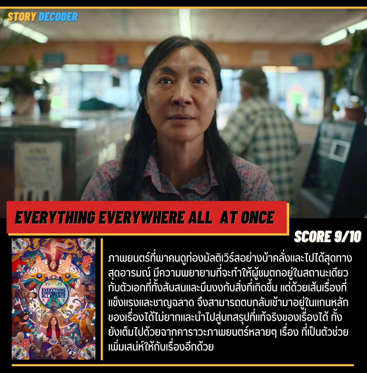 ถ้าการผจญภัยในมัลติเวิร์สของ Doctor Strange in the Multiverse of Madness นั้นมีคำว่าความบ้าคลั่งต่อท้ายแล้ว มัลติเวิร์สใน Everything Everywhere All at Once คงเป็นยิ่งกว่าความบ้าคลั่ง เพราะสิ่งที่หนังประเคนใส่คนดูตลอด 2ชั่วโมง 20 นาที มันคือหลากหลายอารมณ์และเรื่องราว ทั้งความเป็นแอคชั่นศิลปะป้องกันตัว ปรัชญาอันล้ำลึกของการมีอยู่ของจักรวาล ตลกขบขันกับความพิลึกพิลั่นของตัวละคร ความน่ากลัวราวกับภาพยนตร์สยองขวัญ สายสัมพันธ์ครอบครัวที่กระท่อนกระแท่น ความรักและความประนีประนอม ความต่างระหว่างวัย ปัญหาเรื่องเชื้อชาติ การเปิดกว้างเรื่องรสนิยมทางเพศ บลาๆๆ นี่ยังไม่รวมเรื่อง Easter Egg และบรรดาฉากคารวะหนังอีกหลายๆ เรื่องที่ใครรู้มากก็เห็นมากไปอีก หนำซ้ำการตัดต่อและการลำดับภาพก็ยังเล่นกับความรวดเร็วและความบ้าคลั่ง จึงเรียกว่าเป็น 2 ชั่วโมง 20 นาทีที่ไม่รู้จะหาคำไหนมาบรรยายจริงๆ