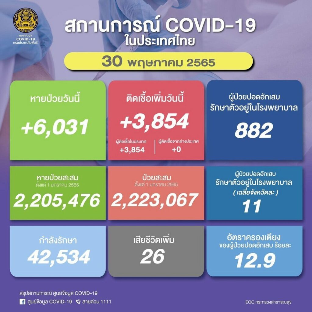 หายป่วยกลับบ้าน 6,031 ราย หายป่วยสะสม 2,205,476 ราย (ตั้งแต่ 1 มกราคม 2565) ผู้ป่วยกำลังรักษา 42,534 ราย และ เสียชีวิต 26 ราย