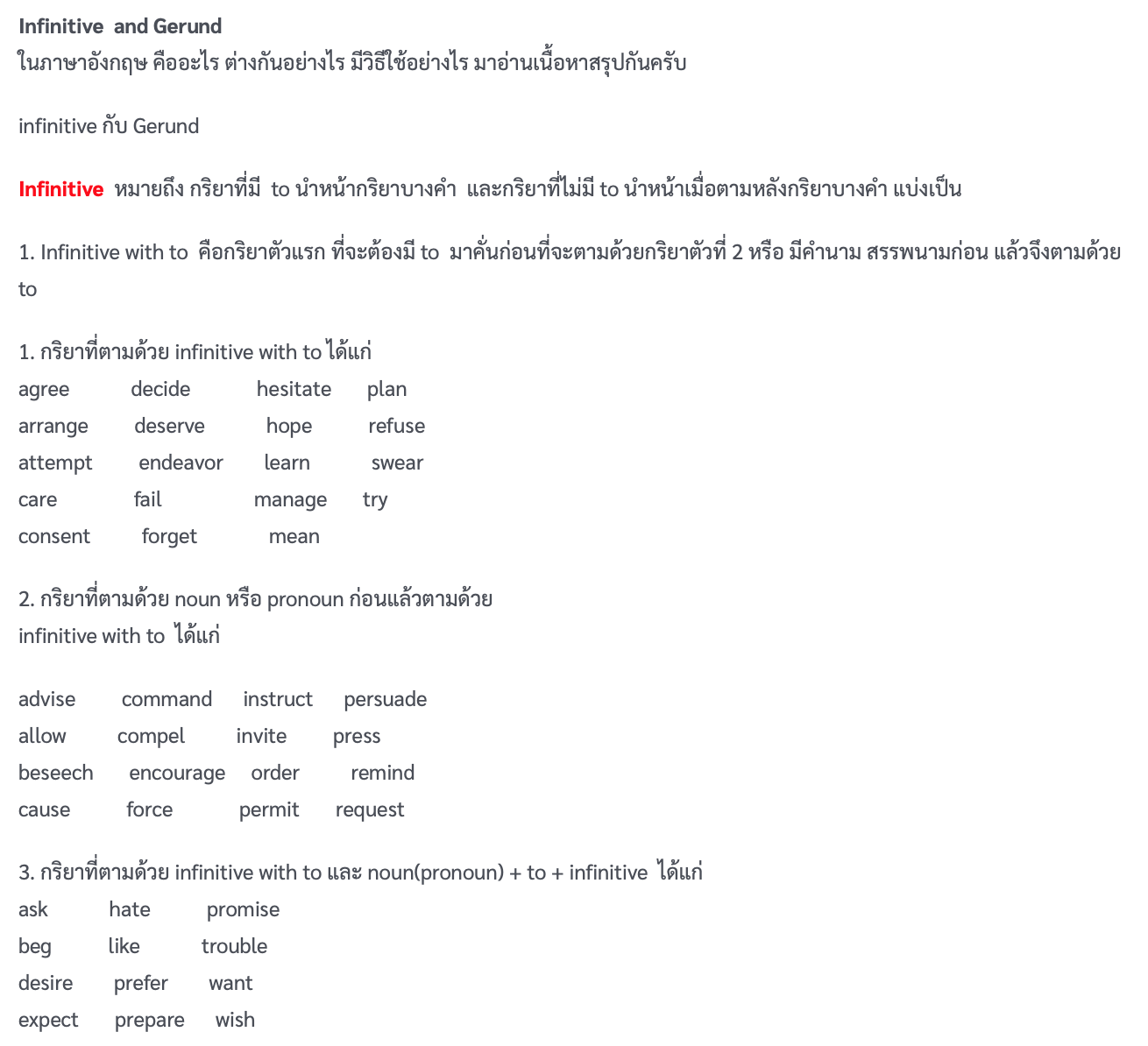 กฏทางไวยกรณ์มีอยู่ว่า ถ้า Main verb ในประโยค ใช้คำกริยาต่อไปนี้ จะต้องใช้ infinitive(to+verb) ตามเท่านั้น คำกริยาเหล่านั้นได้แก่