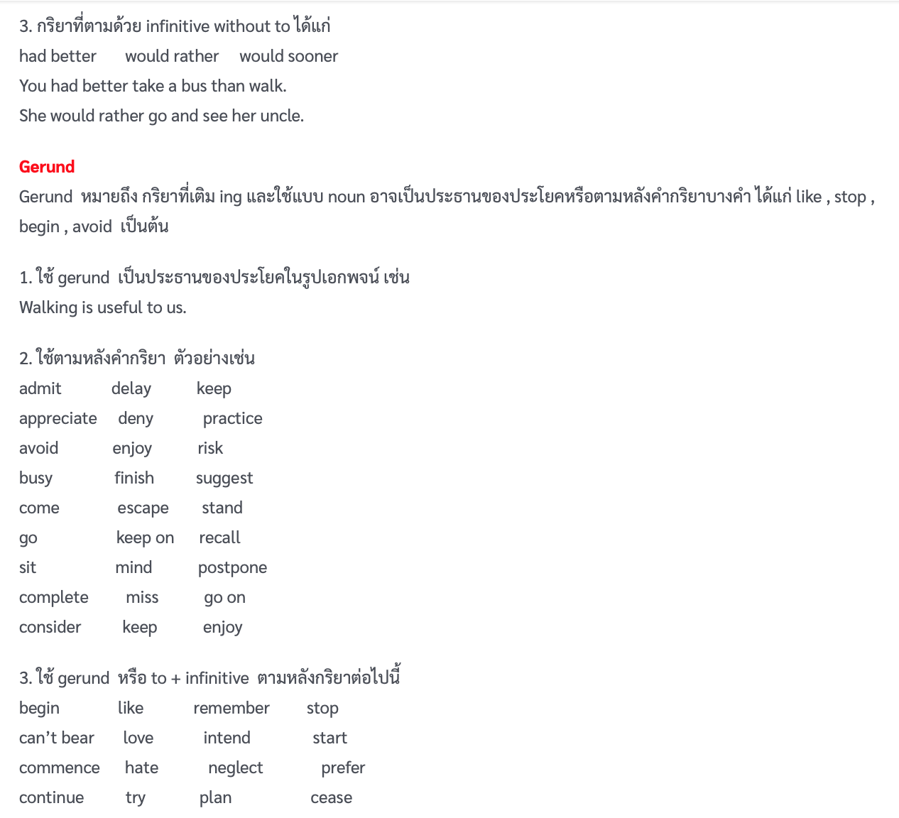 การใช้ Gerunds ก็เช่นเดียวกัน มี Main verbs or the principal verbs อยู่มากที่จะใช้กับ Infinitives ไม่ได้ จะต้องใช้กับ Gerunds เท่านั้น