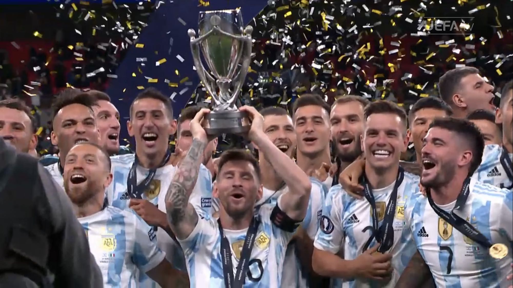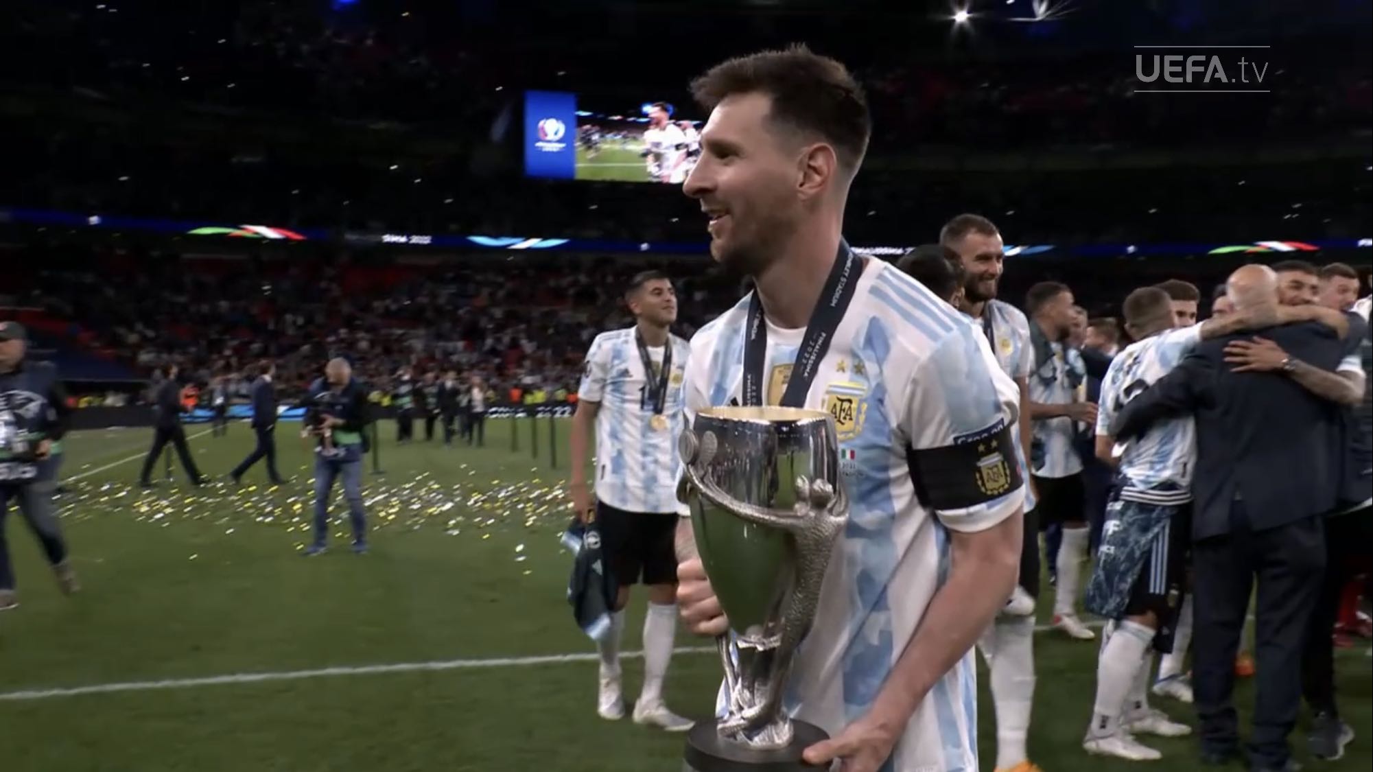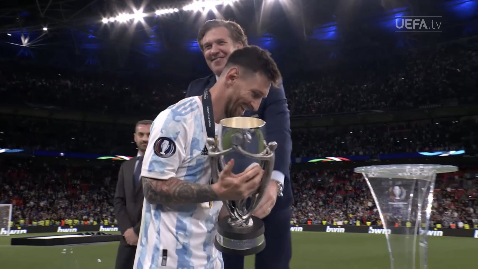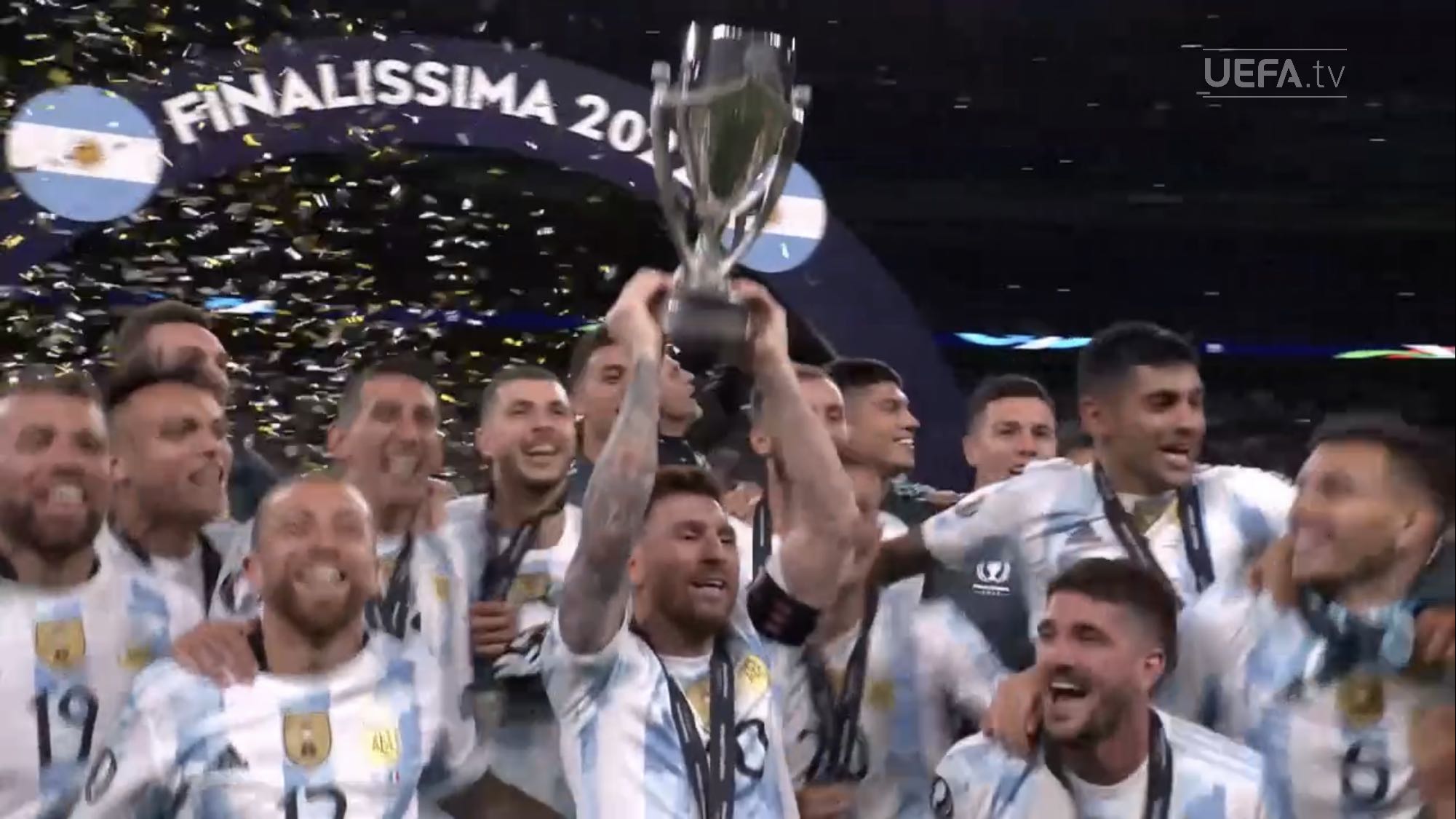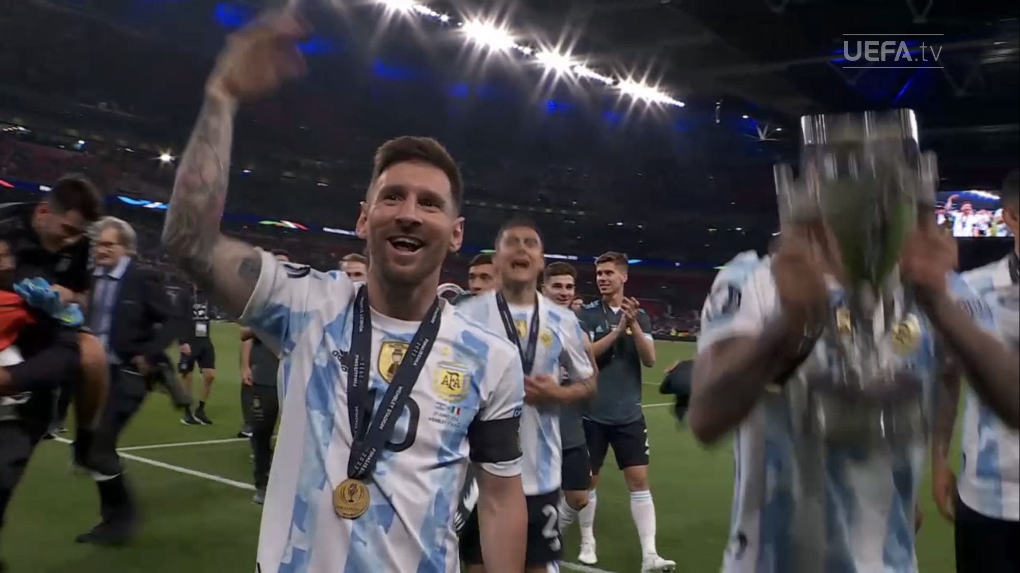 ตอนแรกนึกว่านักเตะยืมทีมชาติมาใช้ฉลองกับทีมต้นสังกัด แต่เห็นภาพใกล้ ๆ แล้วคนละถ้วยกับที่ Messi เอาไปนอนด้วย เห็น Man U แสดงความยินดีกับ Martinez ก็มีแต่เหรียญ
