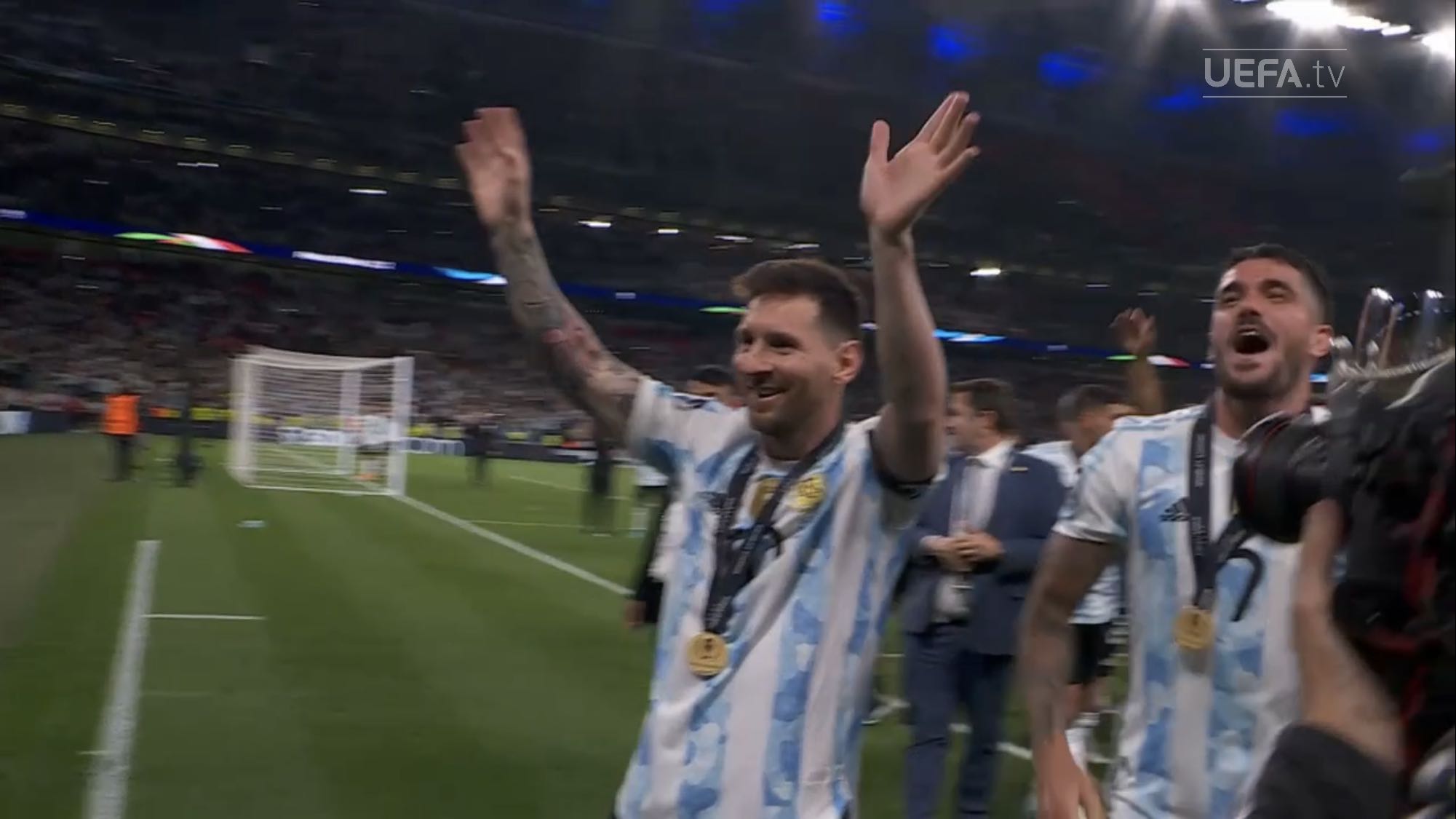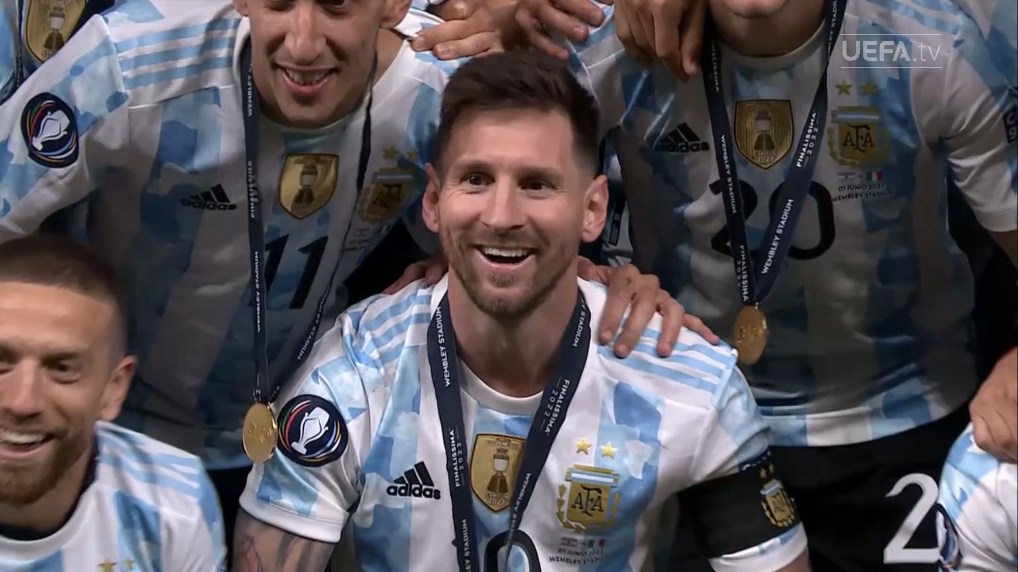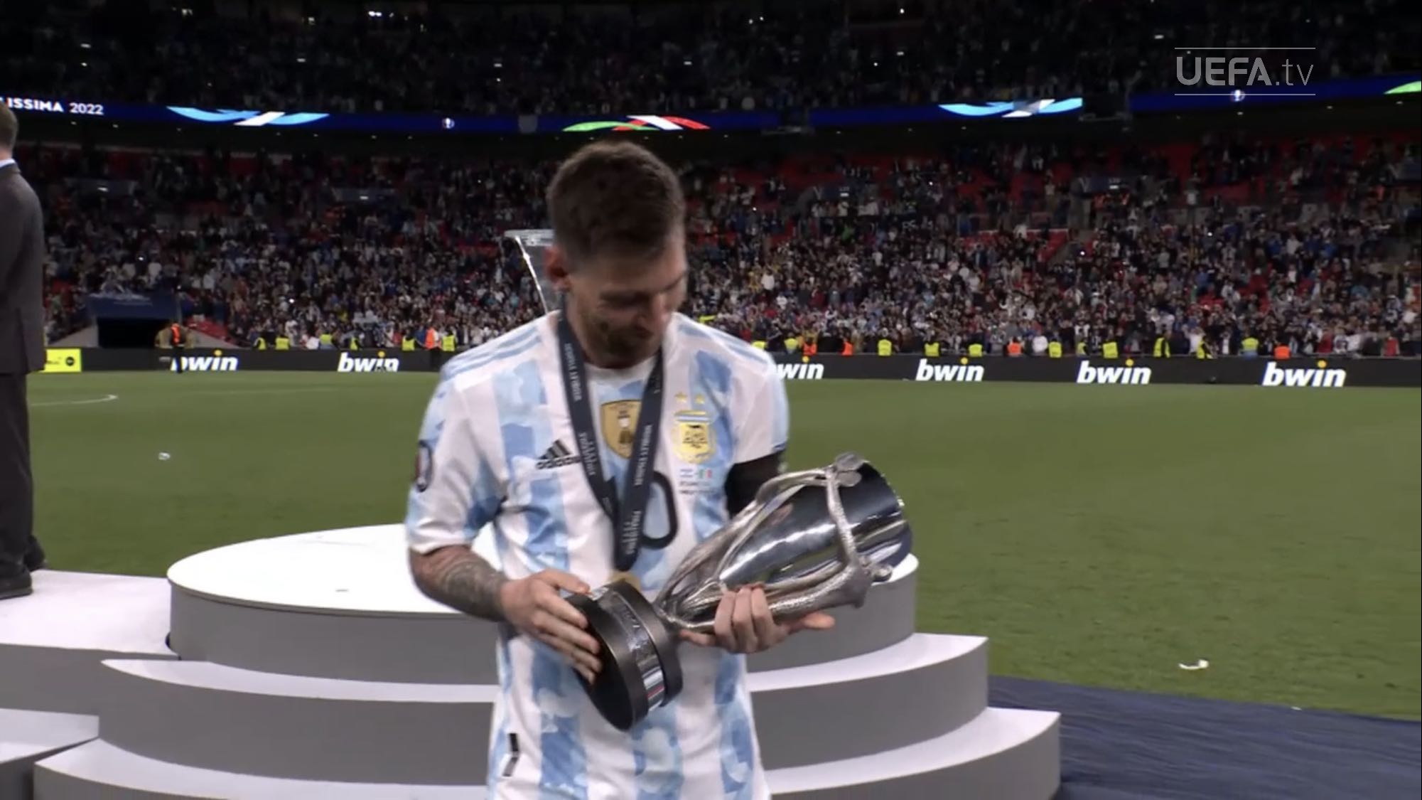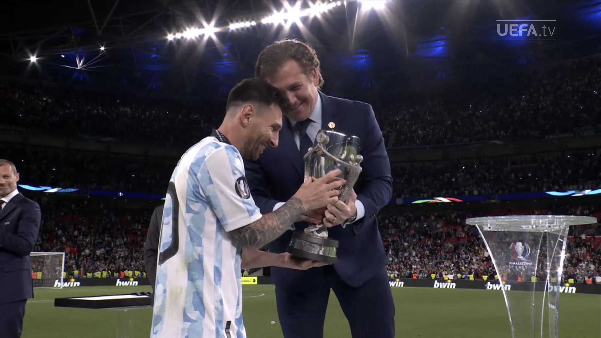 ตอนแรกนึกว่านักเตะยืมทีมชาติมาใช้ฉลองกับทีมต้นสังกัด แต่เห็นภาพใกล้ ๆ แล้วคนละถ้วยกับที่ Messi เอาไปนอนด้วย เห็น Man U แสดงความยินดีกับ Martinez ก็มีแต่เหรียญ