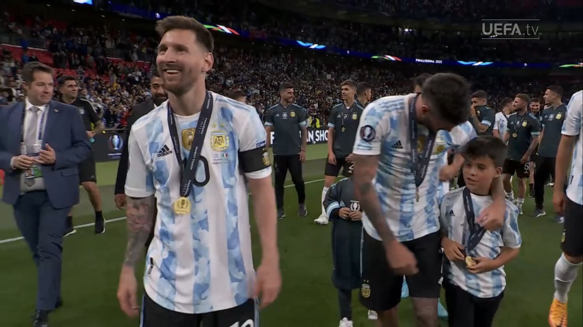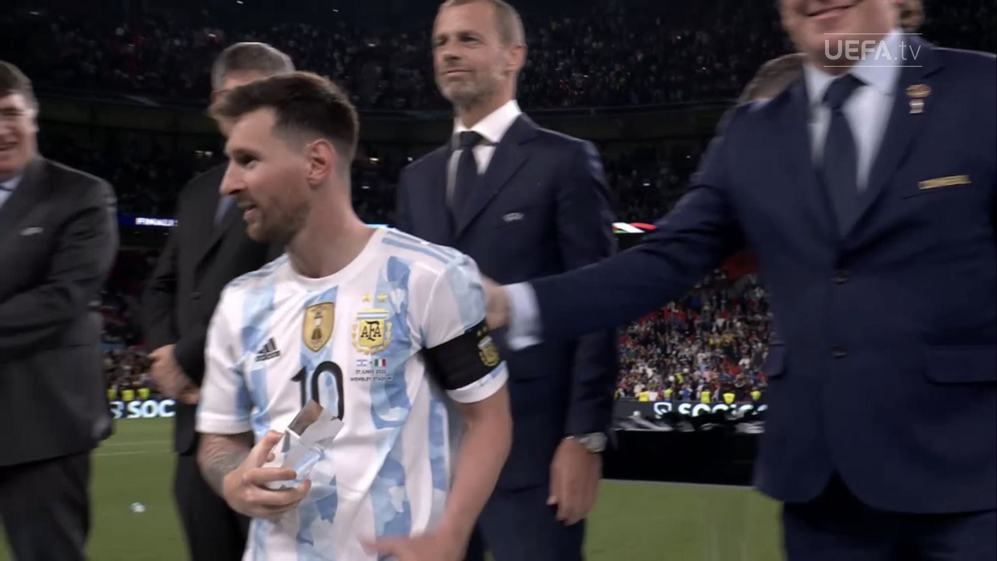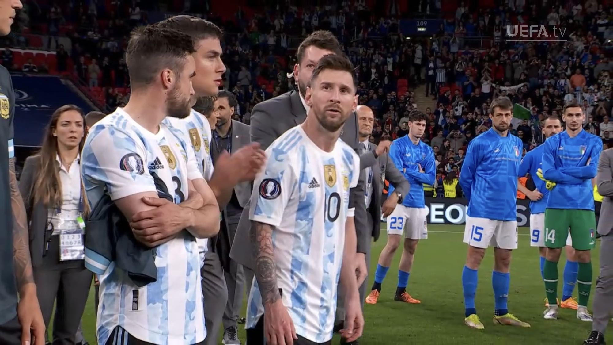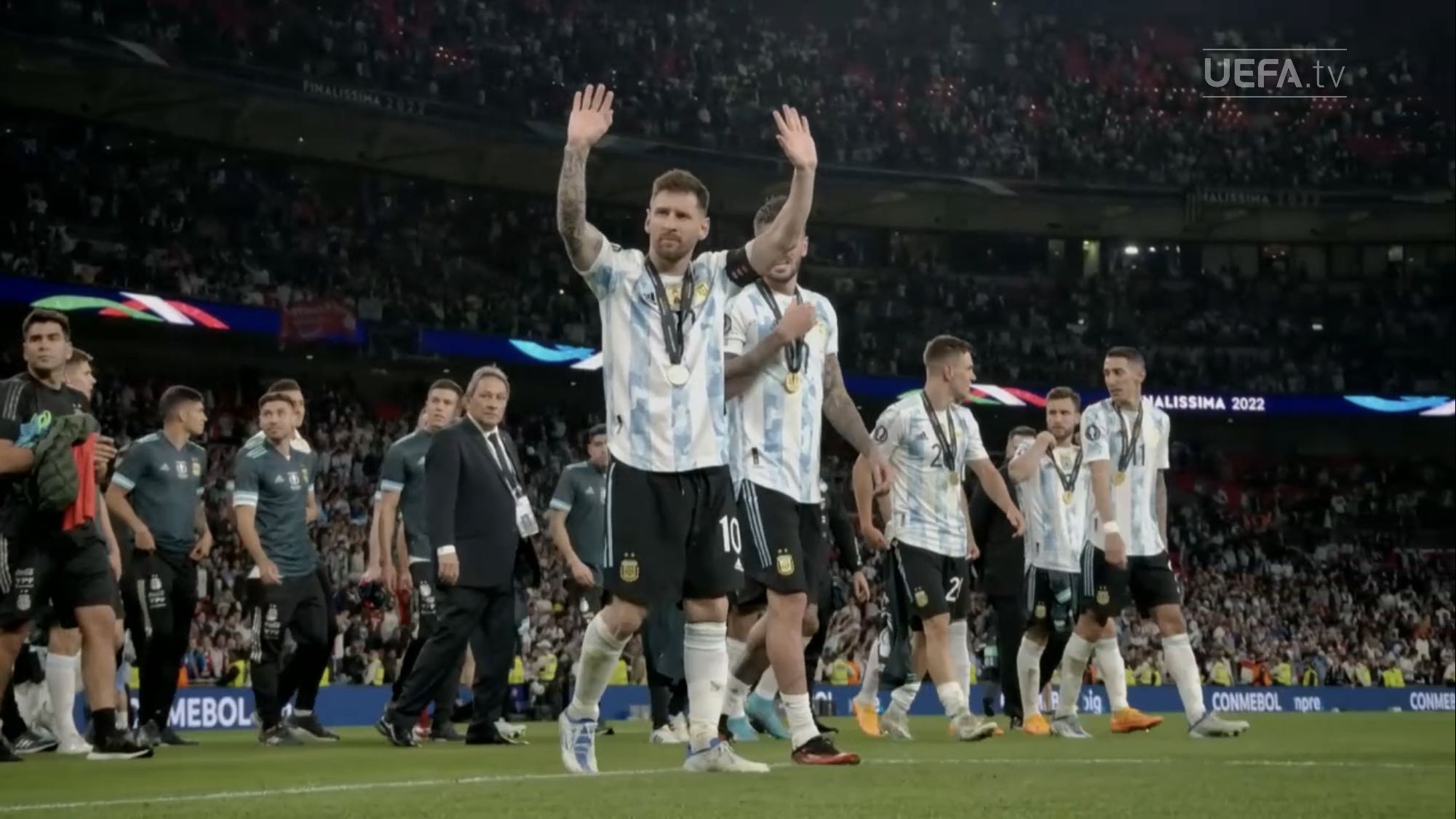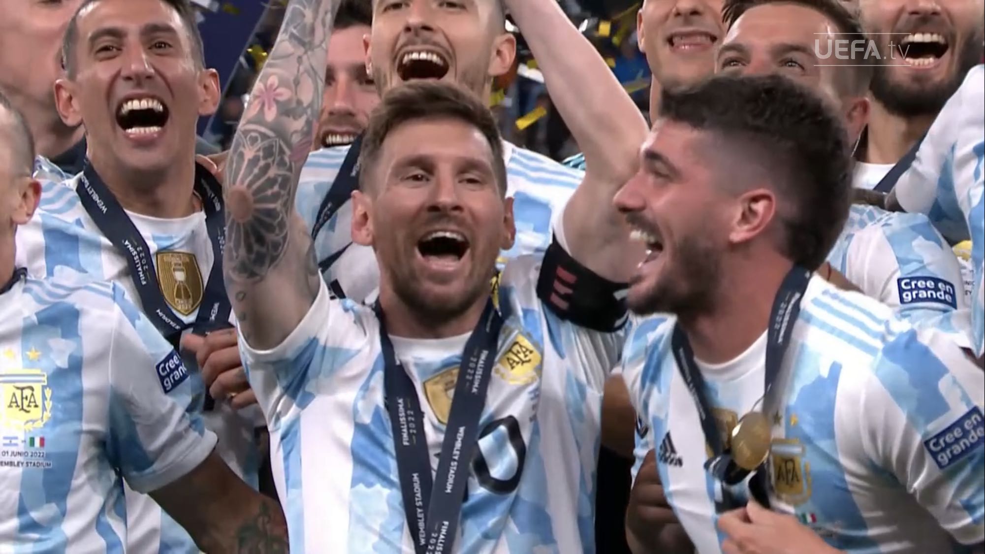 ตอนแรกนึกว่านักเตะยืมทีมชาติมาใช้ฉลองกับทีมต้นสังกัด แต่เห็นภาพใกล้ ๆ แล้วคนละถ้วยกับที่ Messi เอาไปนอนด้วย เห็น Man U แสดงความยินดีกับ Martinez ก็มีแต่เหรียญ