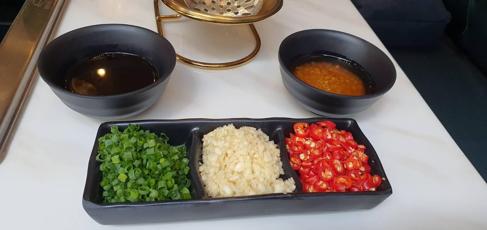 น้ำจิ้มมี 2 แบบ คือน้ำจิ้มพอนสึ และ น้ำจิ้มน้ำมันกระเทียมแบบไต้หวัน