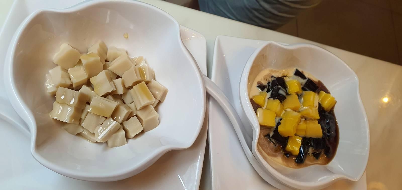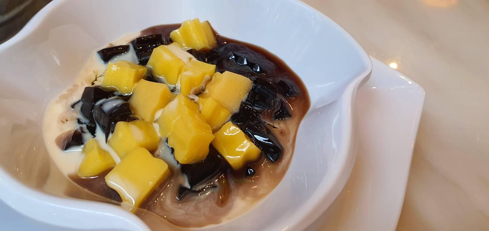 ขนมกุ้ยหลิงเกาและมะม่วงรสสัมผัสลัมุนลิ้น ราดน้ำเชื่อมนมรสหวานอ่อนๆ และอัลมอนด์พุดดิ้ง ของหวานคลายร้อน ราดน้ำเชื่อมน้ำตาลทรายแดง ให้ความสดชื่นเบา ๆ ล้างปากปิดมื้อได้อย่างดีค่ะ