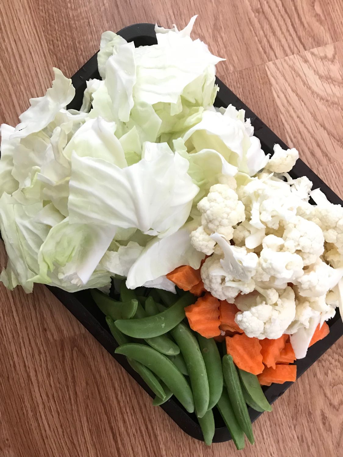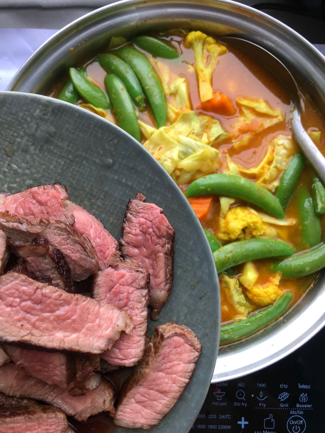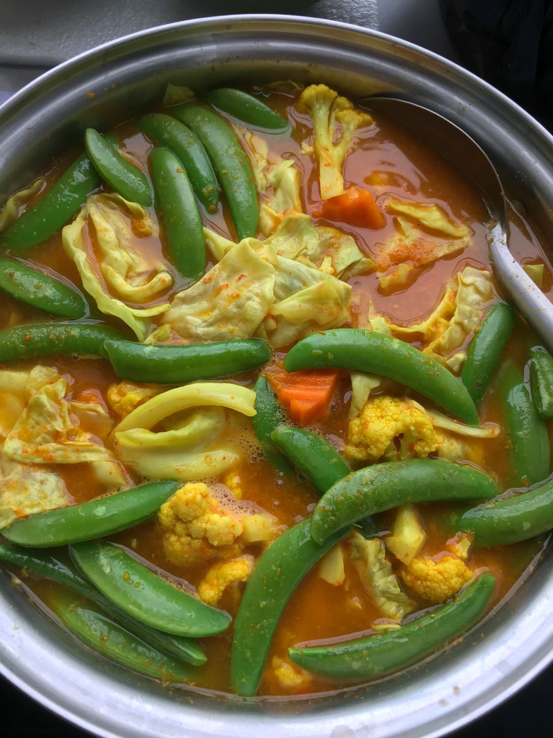 พริกแกงส้มใต้ เนื้อสัน ผักกะหล่ำปลี ดอกกะหล่ำ แครอท ถั่วลันเตาหวาน